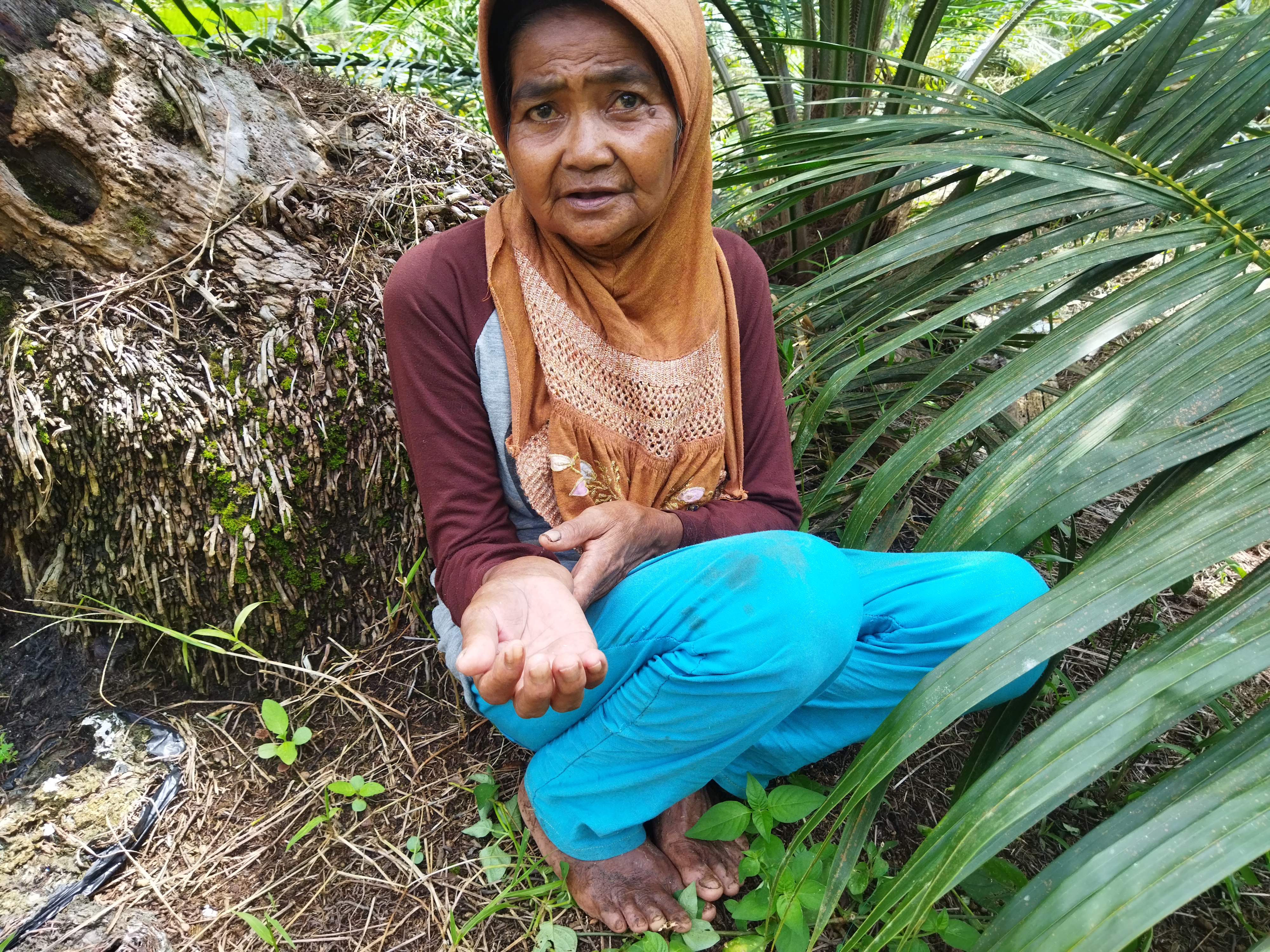 Dulu ia bekerja sebagai buruh tanam padi, namun usia dan penyakit asma membuatnya hanya mampu duduk atau berbaring. Untuk makan, ia mengandalkan tetangga dan kebaikan guru-guru yang sesekali mengirimkan makanan.