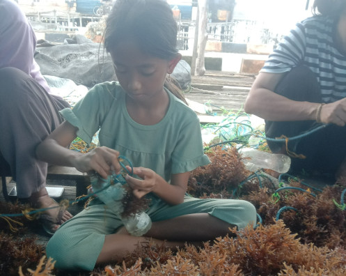 Aqila cerita, seringkali tangan nya kesakitan karena tergores tali tambang saat mengikat rumput laut tapi, ia tetap kuat dan semangat.