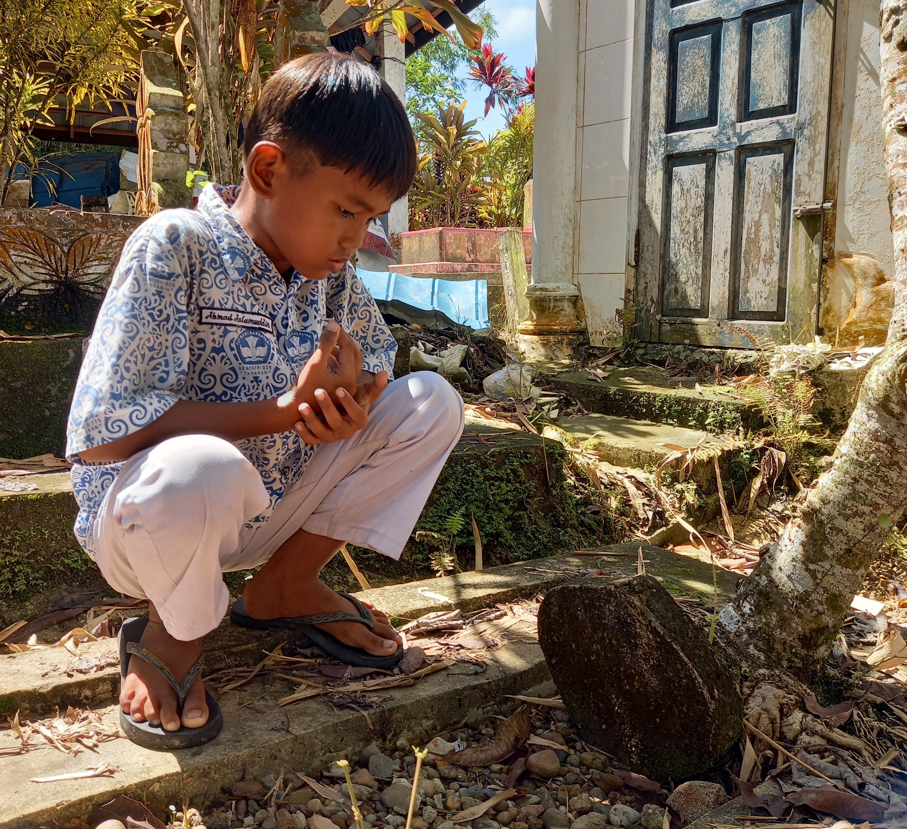 Aslan bercerita bahwa sepatu sekolahnya sudah bolong, kalau dipakai ke sekolah di musim hujan sering masuk airnya.