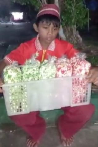 Setiap sore hingga malam hari sepulang sekolah, ia keliling jualan popcorn milik pamannya. Upah yang didapatkan tak tentu, paling banyak 30 ribu. Jika tidak, biasanya ia membawa pulang 10 ribu saja.