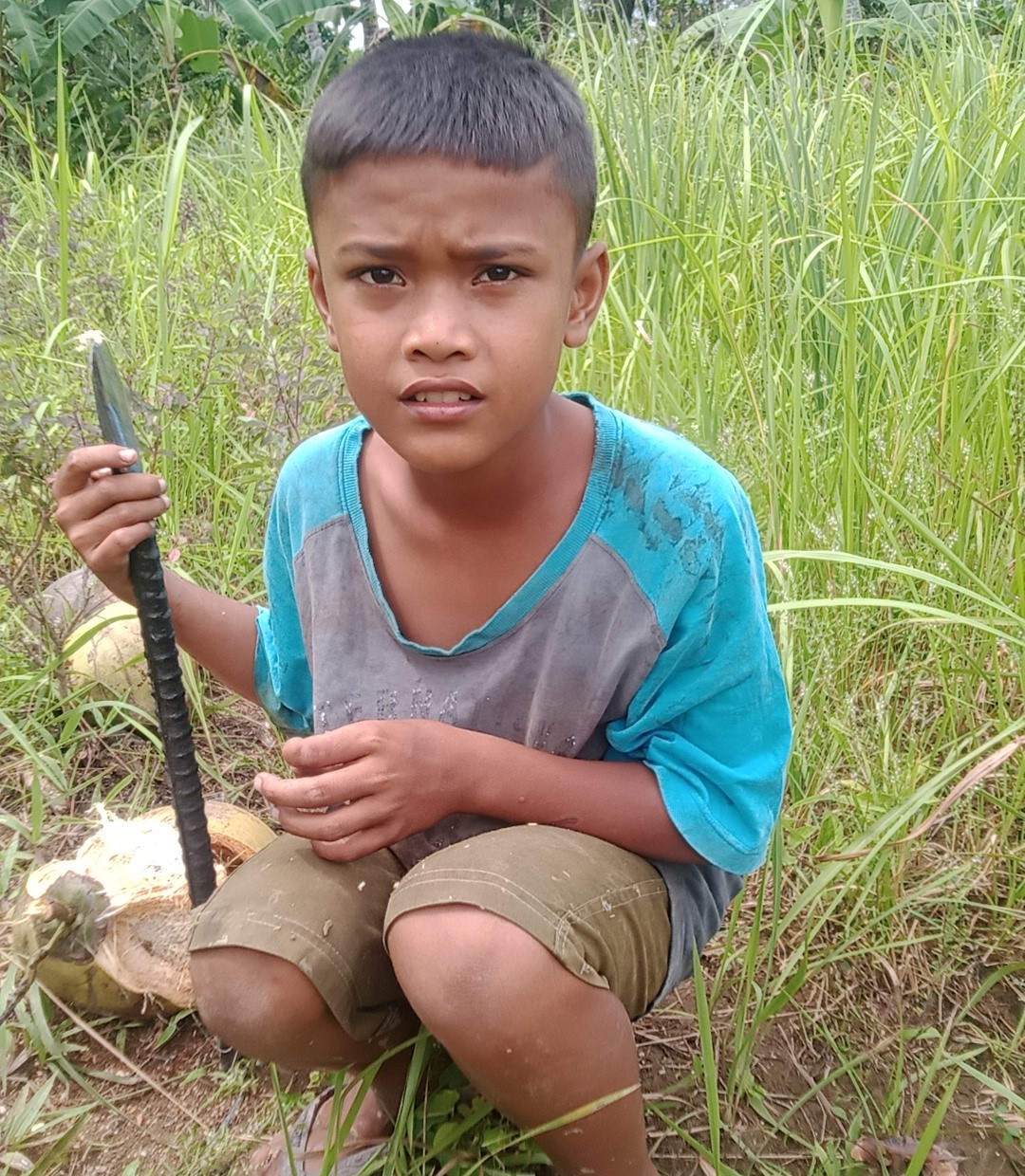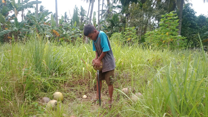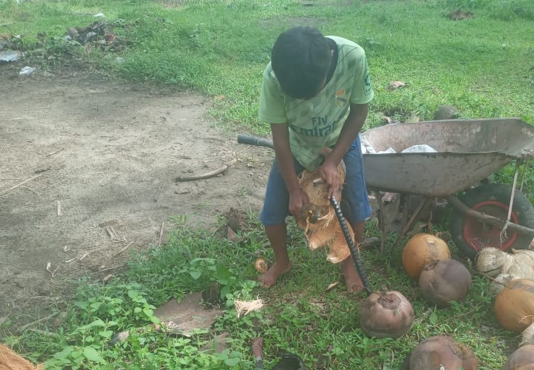 Setiap hari sepulang sekolah, Fikri (9) tak langsung bermain seperti anak lainnya. Ia menuju tempat pengupasan kelapa, membantu orang mengupas hingga 150 buah setiap harinya.
