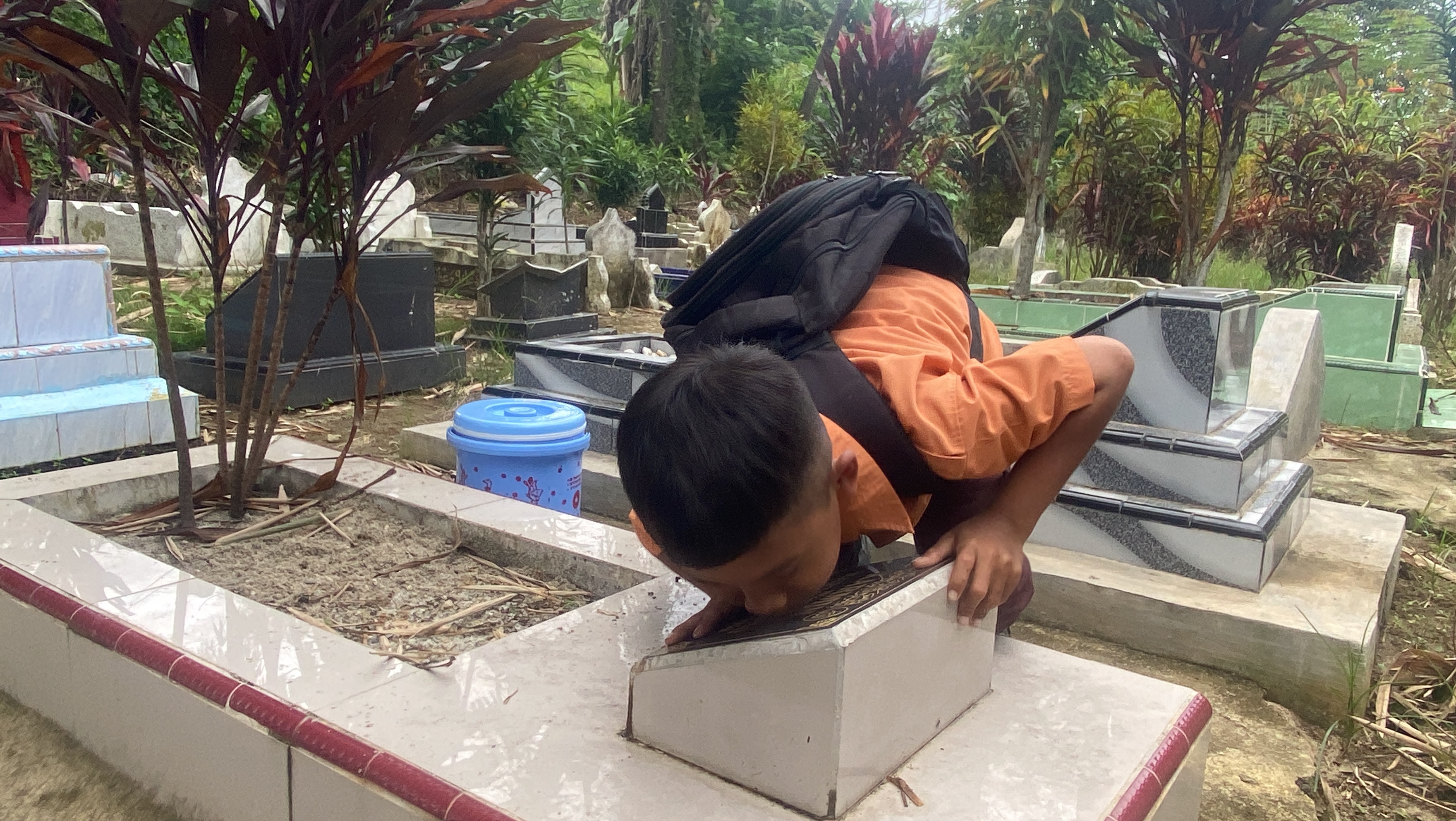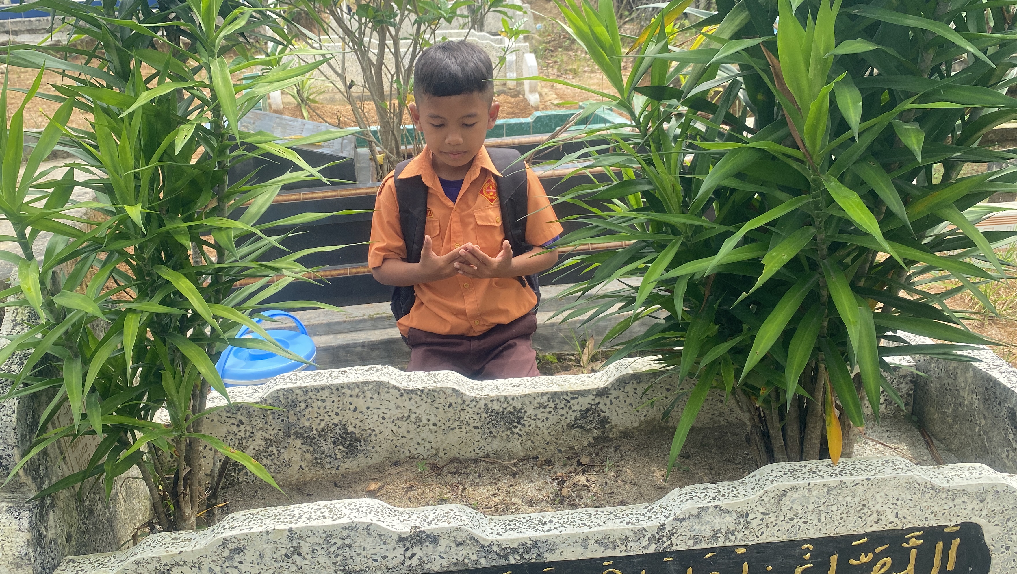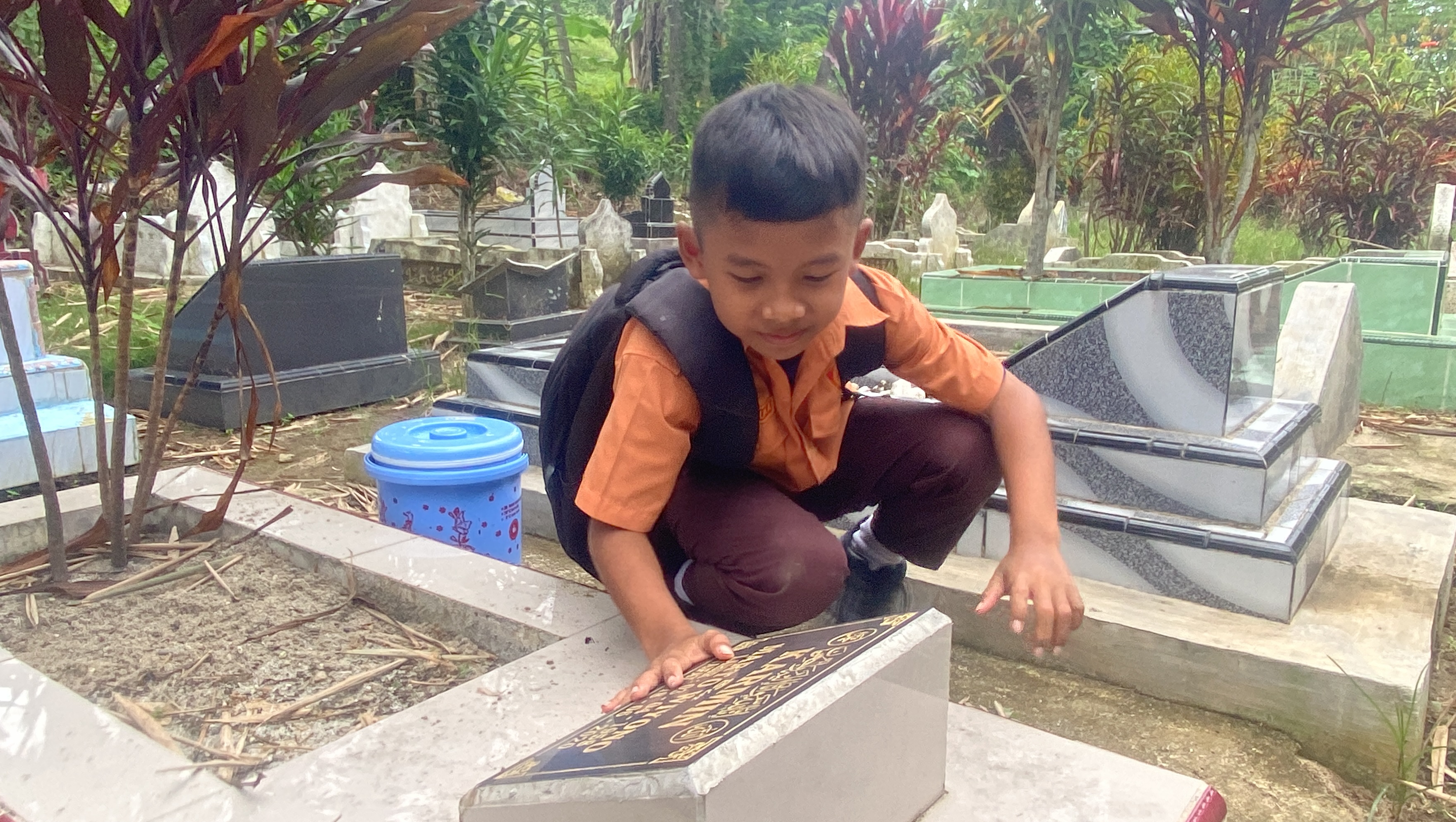“Nggak mau nangis kak, karena kata ustadz kalau menangis nanti mama sama ayah tersiksa di sana, hamzah nggak mau bersedih, hamzah mau berdoa saja agar ayah dan mama ditempatkan di surganya allah” Hamzah