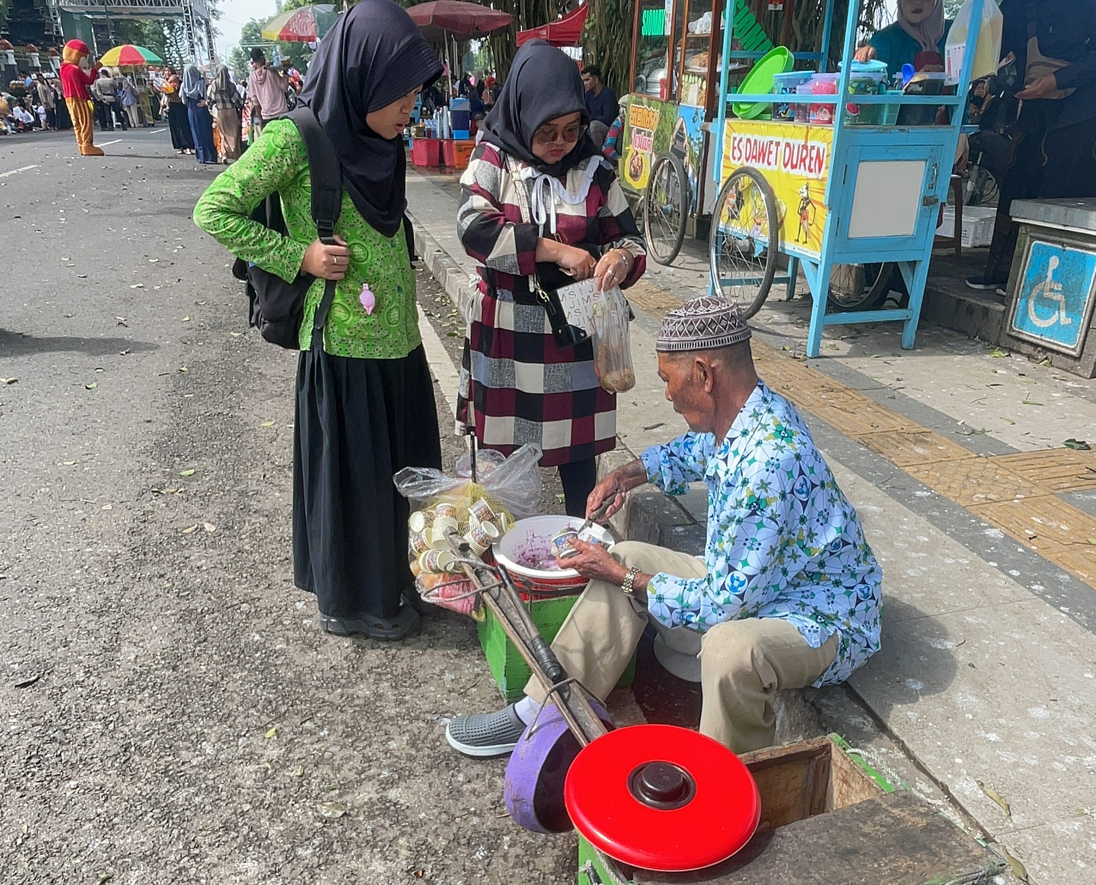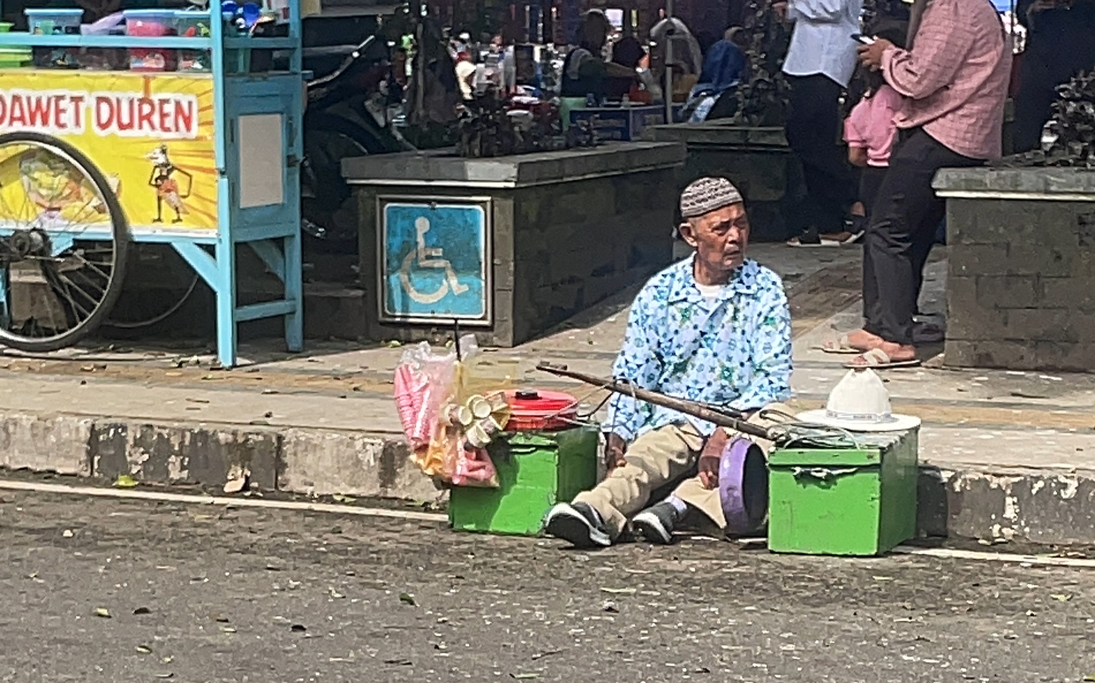 “mbah udah capek jalan keliling jauh tapi ngga ada yang beli” kelihatannya ramai tapi sepi pembeli”ujar kakek Muhyanto.