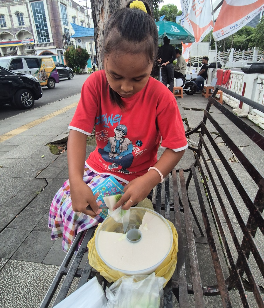 Meski harus berjualan, Naviza tetap belajar. Ia kini duduk di kelas 4 SD, berusaha keras agar sekolah tetap berjalan meski terbatas.