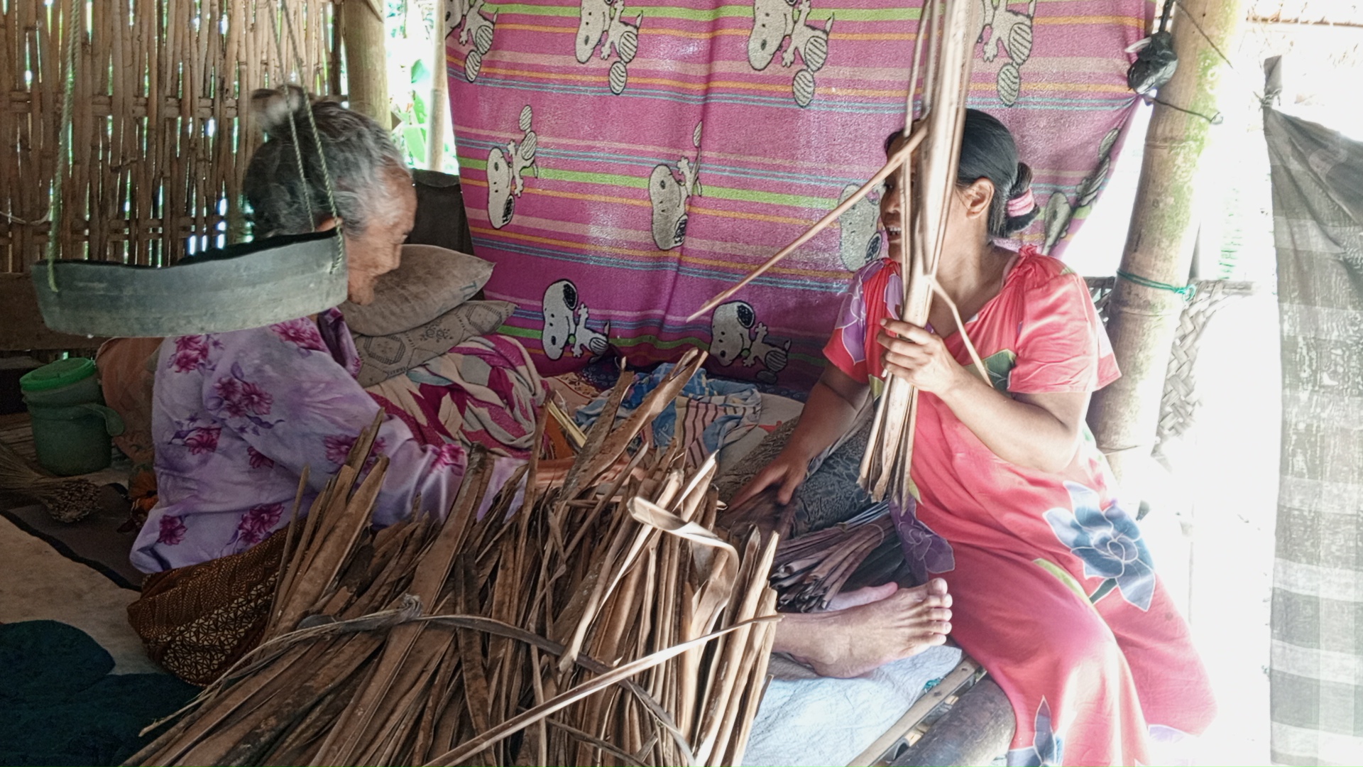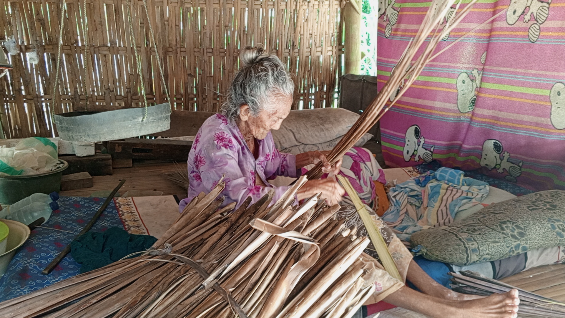 Setiap pagi ia masih berusaha memungut daun kelapa kering di sekitar rumahnya. Ia ikat satu per satu, lalu duduk di depan rumah menunggu ada yang lewat untuk membeli, Itu satu-satunya cara ia bertahan hidup.
