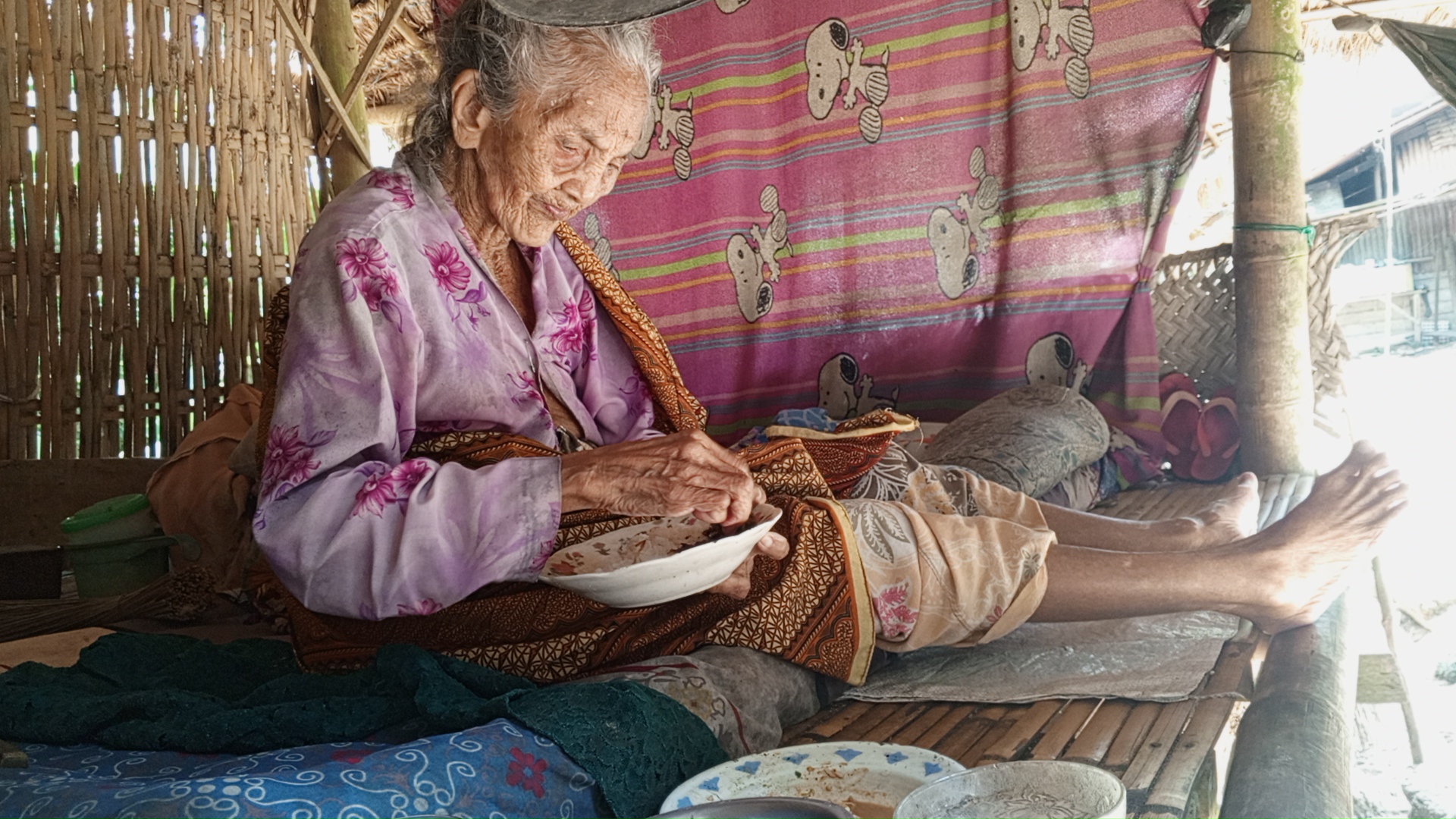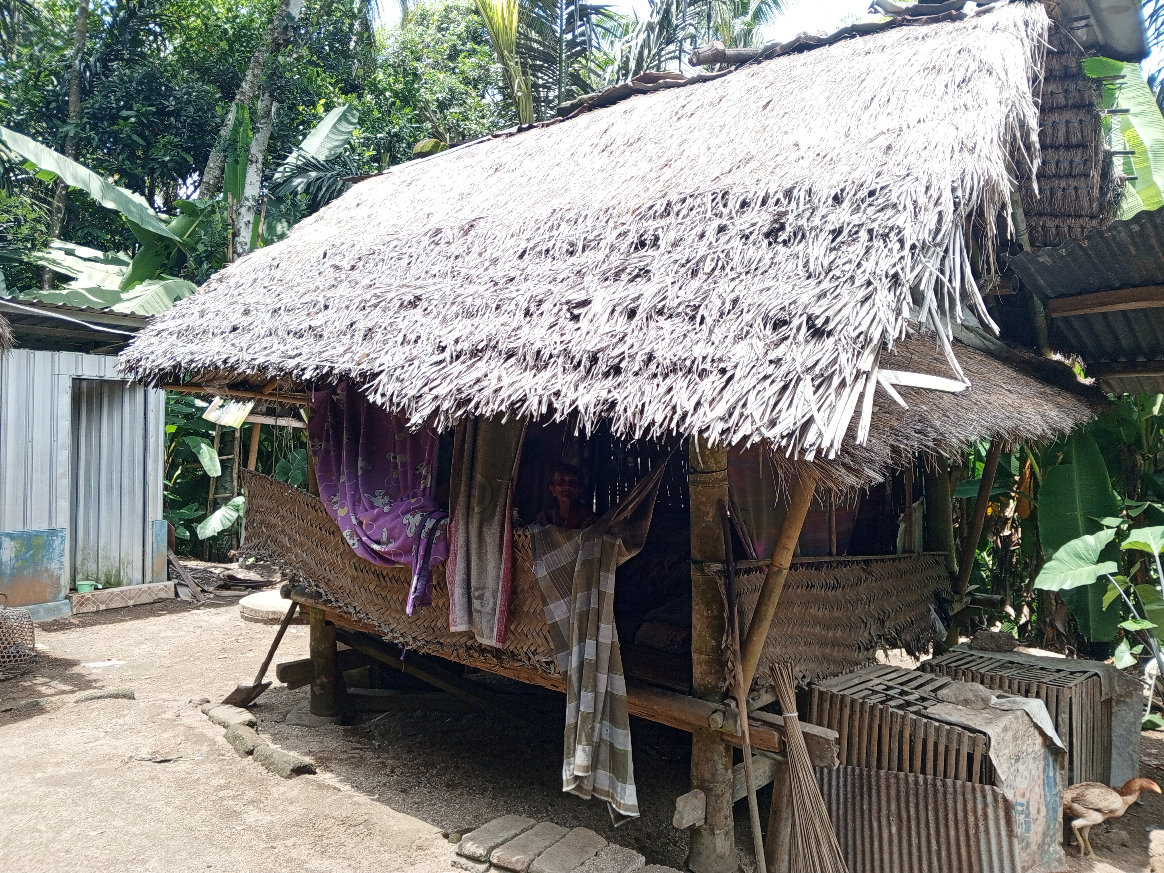 Ia tinggal dirumah tua dari anyaman daun dan kayu lapuk, tanpa dinding, tanpa kamar, hanya satu ruang kecil terbuka — tempat Nenek Ijah tidur,berteduh dan bertahan hidup.