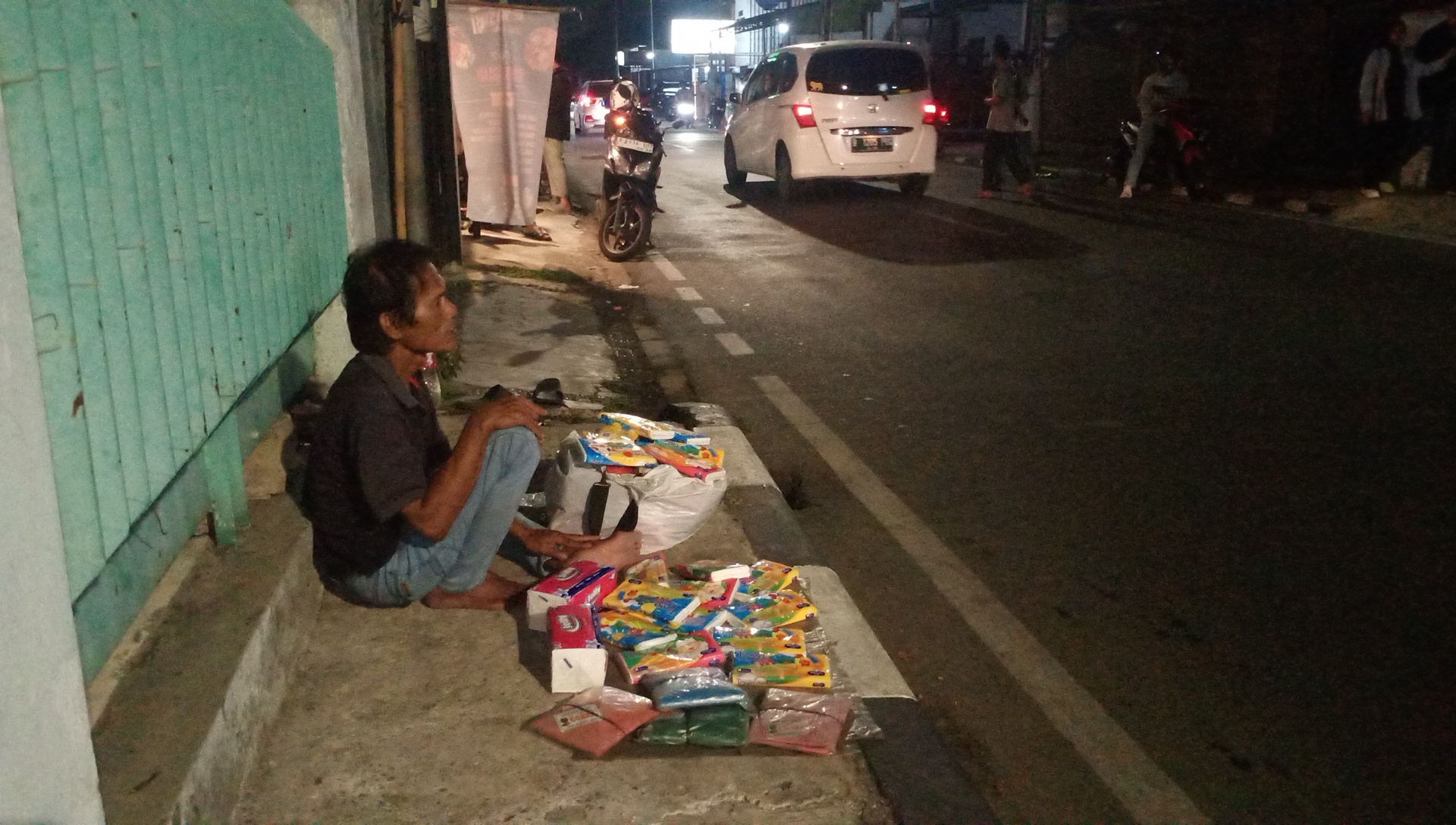 Menjadi penjual asongan membuat pak Yadi harus berjualan hingga malam hari. Barang yang dijual merupakan miliknya sendiri yang ia beli kemudian dijual kembali.