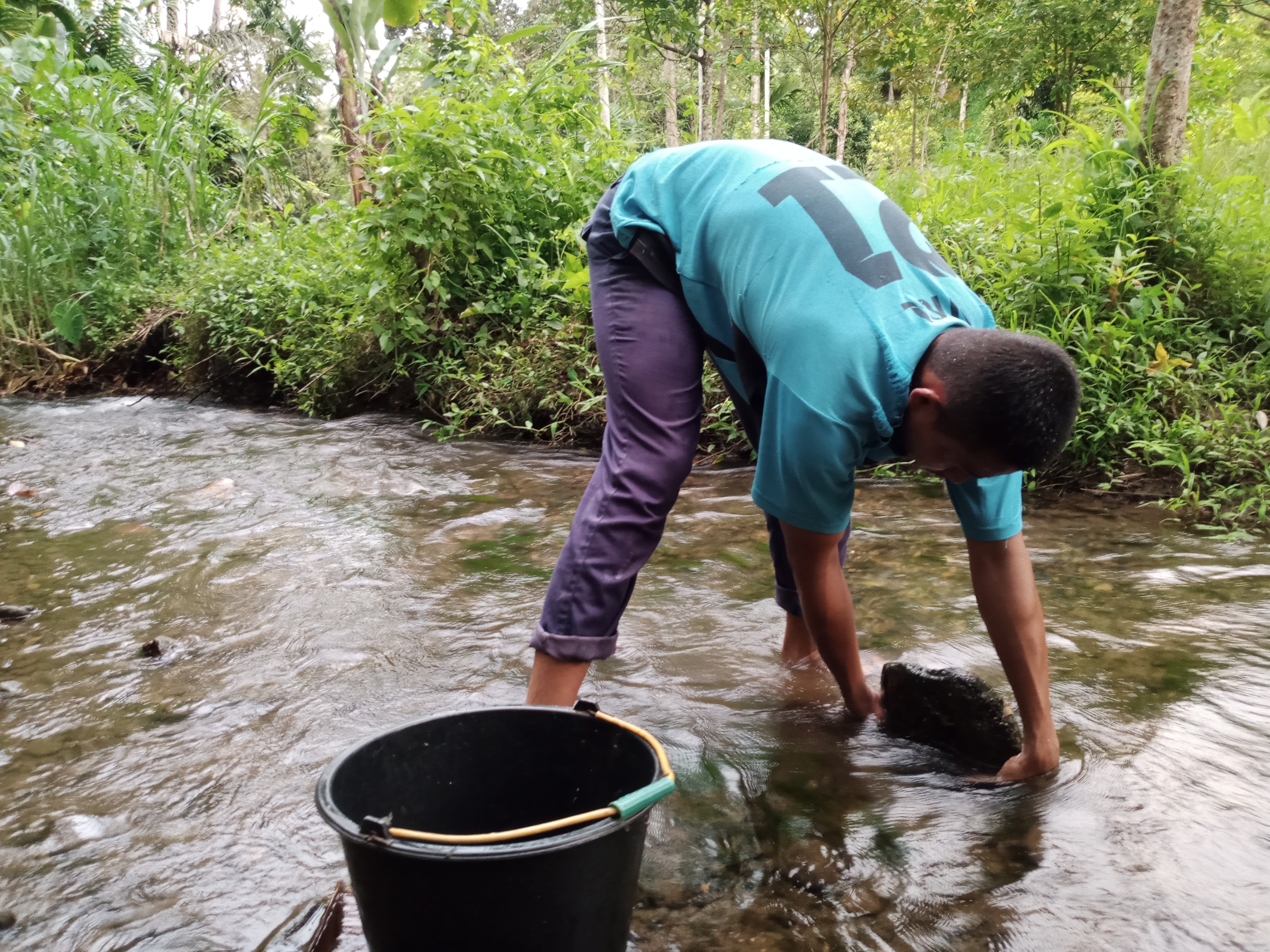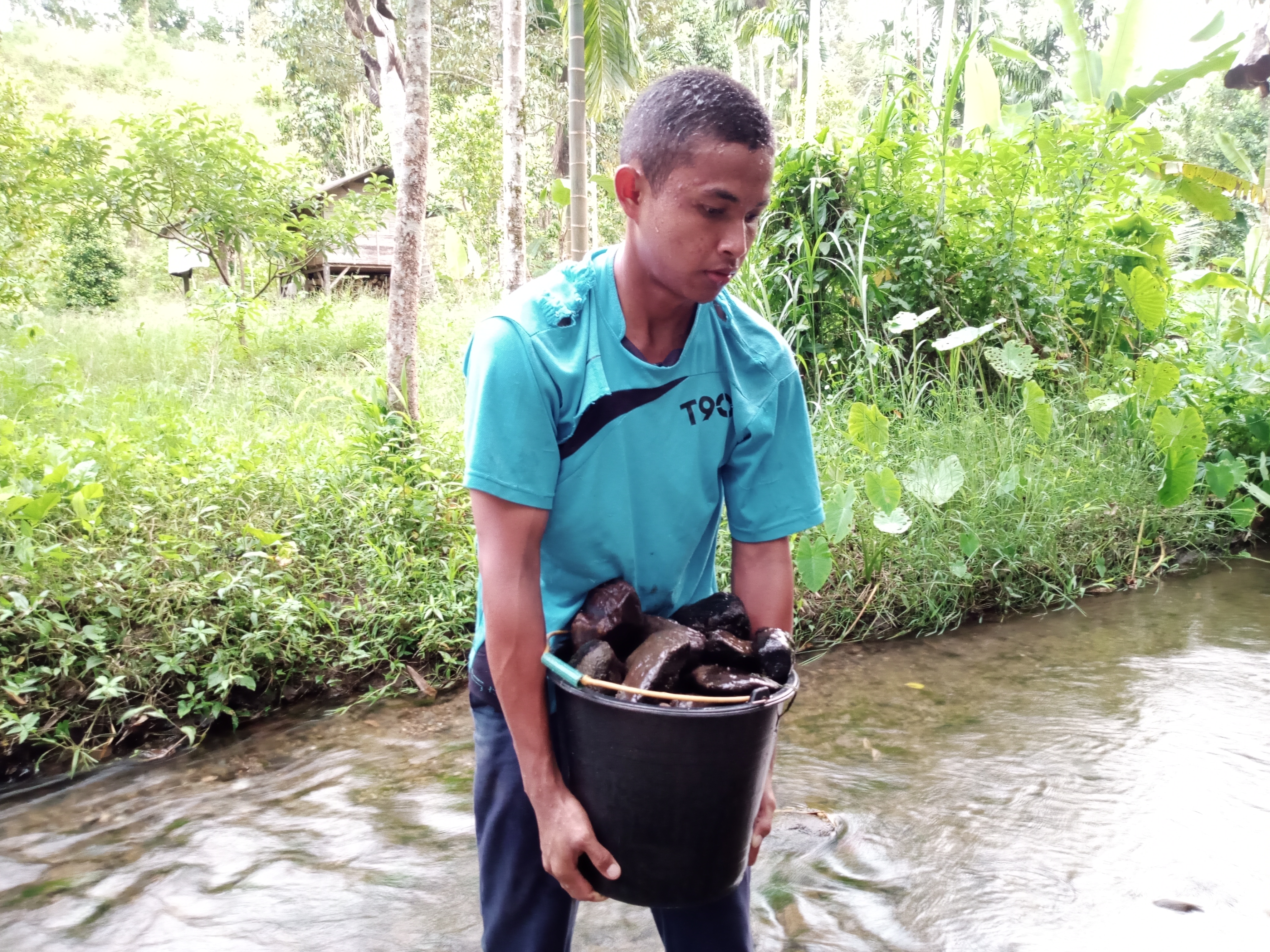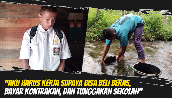 Saleh (16) yang kini duduk di bangku kelas 2 SMA ini bekerja dengan mengambil batu di sungai. Ia berjalan kurang lebih 1-2 KM ke sungai, agar ia bisa sekolah dan menghidupi bibinya (65) yang kini tengah sakit-sakitan.