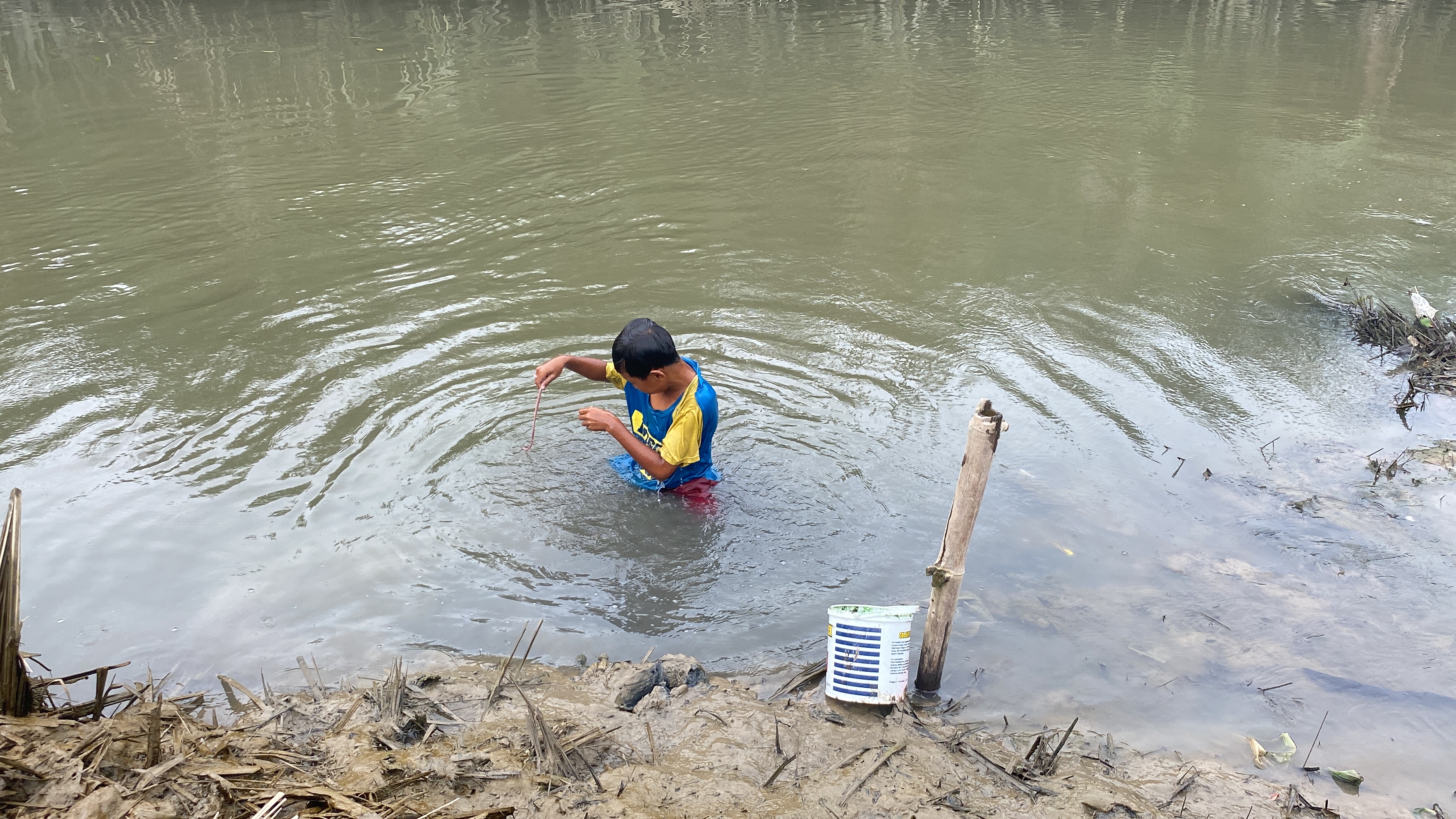 Kondisi yang sama pun dirasakan oleh Agung. Anak 11 tahun ini harus bertaruh nyawa mencari cacing di sungai demi bisa makan.