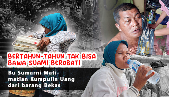 Sejak 3 tahun lalu suaminya menderita sakit, bu Sumarni (47) harus berjuang sendirian mencari nafkah untuk suami dan anaknya. Suaminya menderita sakit stroke, ia hanya bisa duduk dan mengesot saja.