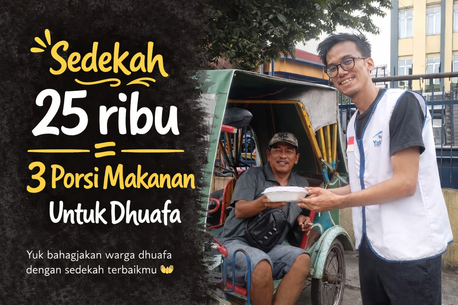 Dengan hanya Rp25.000, kalian sudah bisa menghadirkan 3 piring nasi hangat dengan lauk sederhana untuk saudara-saudara dhuafa yang membutuhkan.