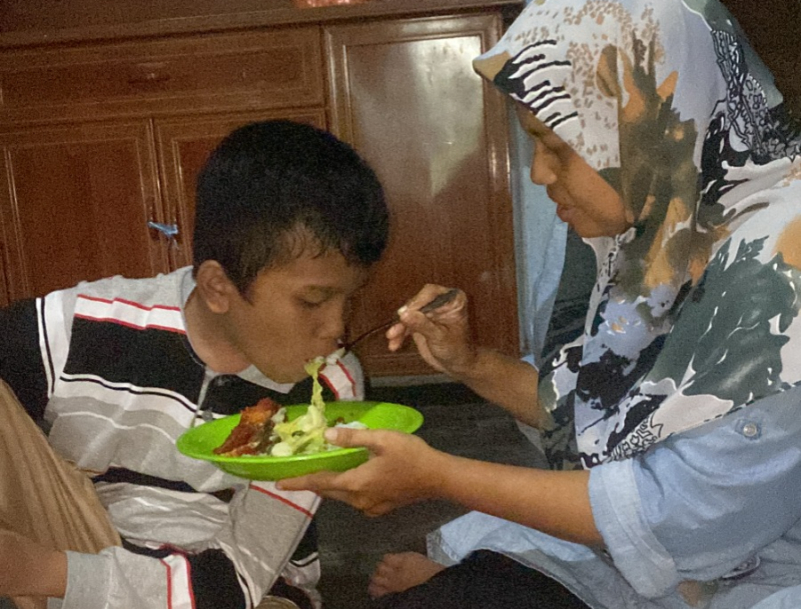 Suaminya sudah meninggal 3 tahun yang lalu. Kini ia harus mengurus anaknya yang mengidap kelainan jantung, autis, dan epilepsi sendirian, Rizky (11).