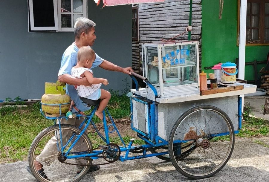 Seringnya ia tak bisa berjualan karena harus merawat istri dan anak bungsunya. Kadang pun ia terpaksa mengajak si kecil ikut berjualan keliling.