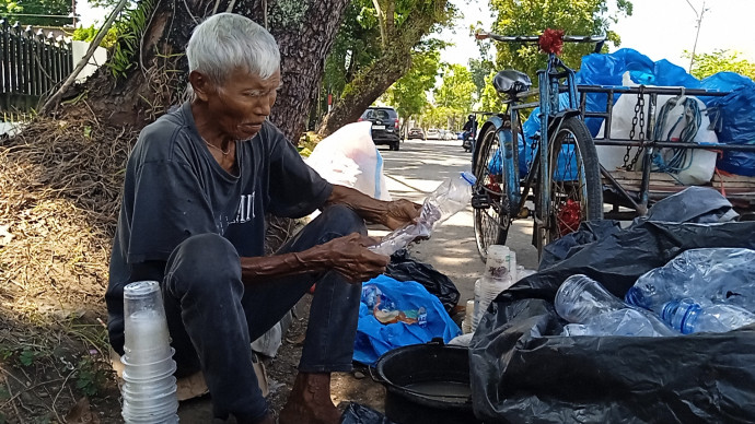 Di usia 76 tahun, Kakek Amril masih harus berjuang mengumpulkan barang bekas demi bertahan hidup. Setiap pagi sekitar pukul 6, ia mendorong becak sepedanya keluar dari kontrakan kecil tempat ia tinggal seorang diri. Dengan becak miliknya itu, kakek berkeliling menyusuri jalan mencari botol plastik, kardus, dan barang bekas lainnya hingga sore.