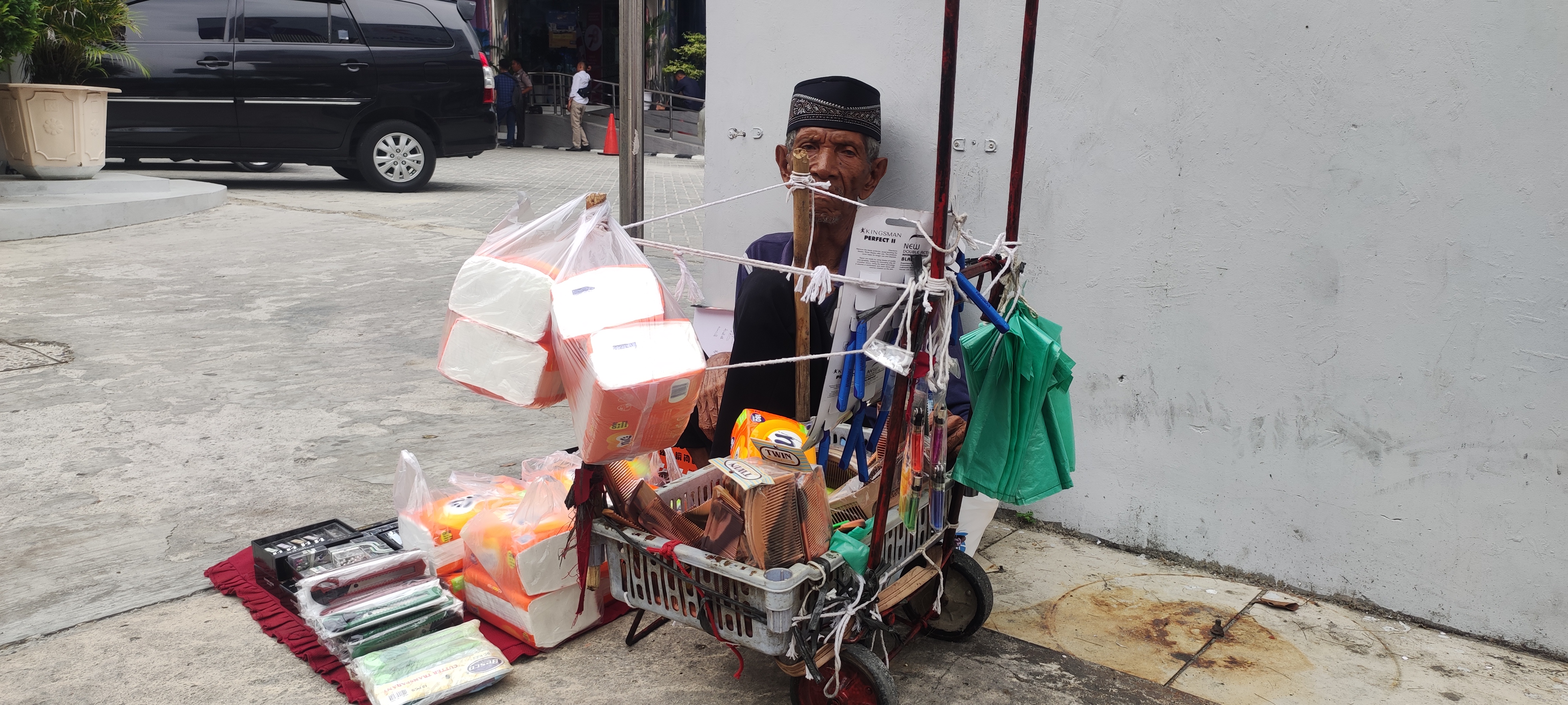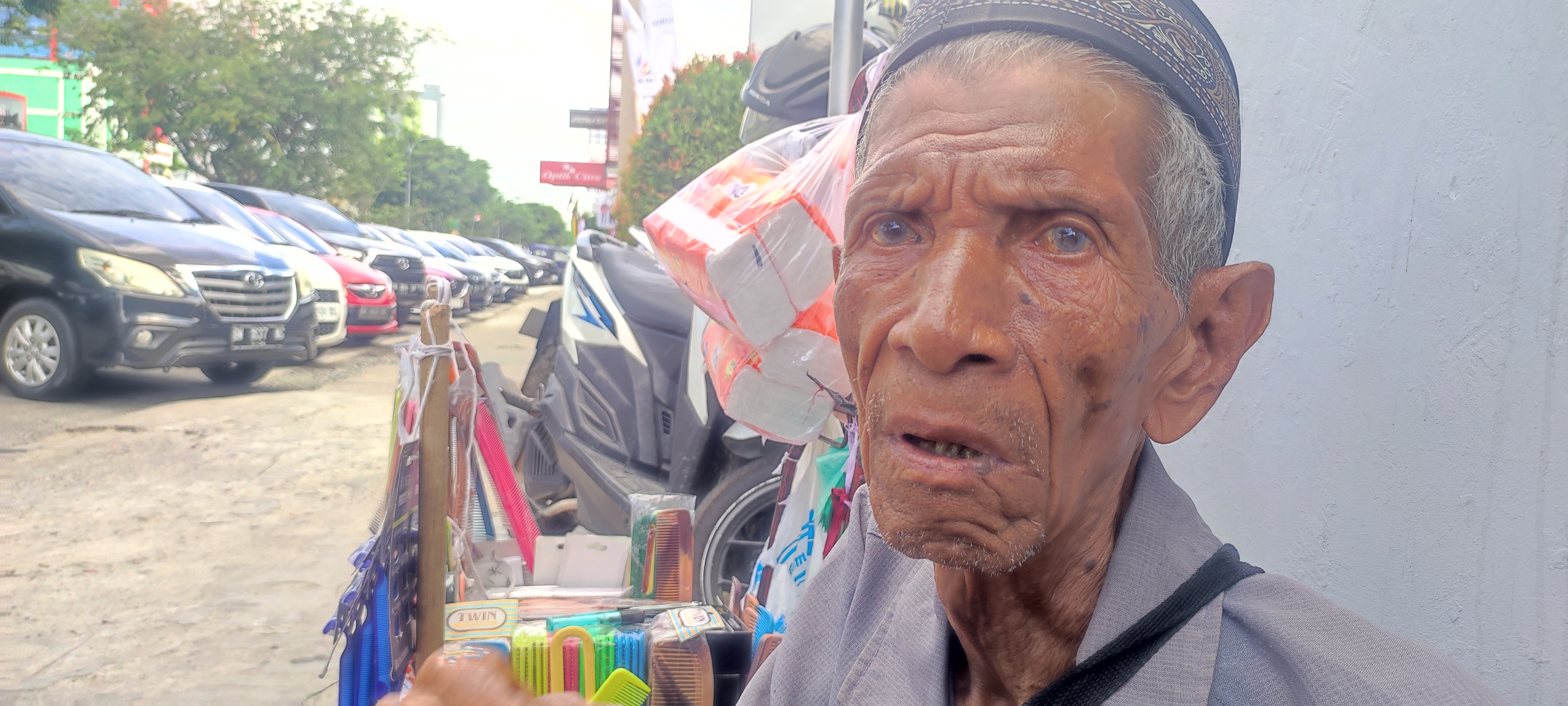 Kakek cerita kalau jualan dari jam 2 siang hingga jam 6 sore. Satu sisir harganya 5 ribu, kalau tisu kakek jual 10 ribu. Tapi, jarang laris, terkadang kakek hanya diupah beras saja. Sisir dan tisu yang kakek jual adalah milik orang lain, kakek hanya menjualkan saja.