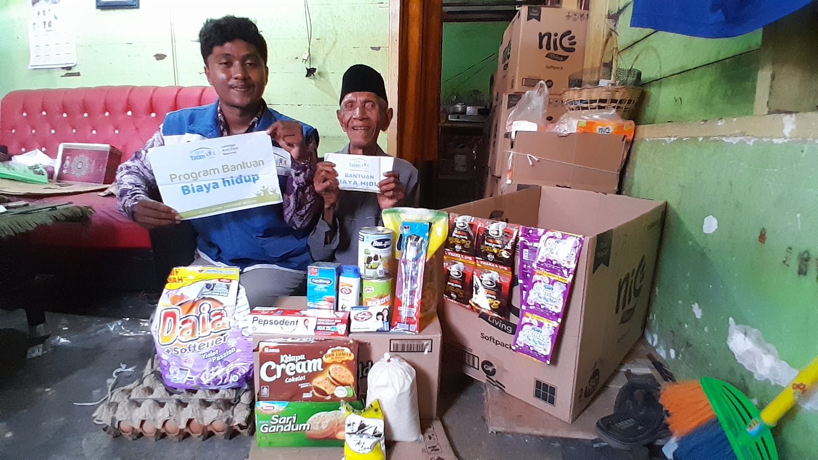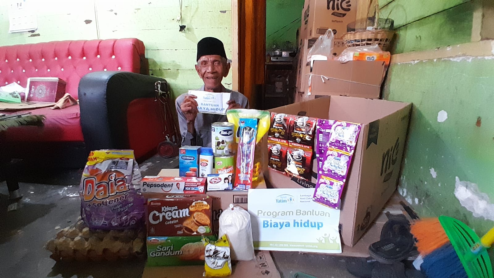 Bantuan yang diberikan adalah bantuan biaya hidup berupa minyak, susu, teh, garam, telur, kopi, snack, sabun mandi, sampo, sabun cuci, pasta gigi dan lain lain nya, tak hanya itu, tim kami juga memberikan bantuan berupa uang tunai guna membantu kebutuhan sehari hari lainnya.