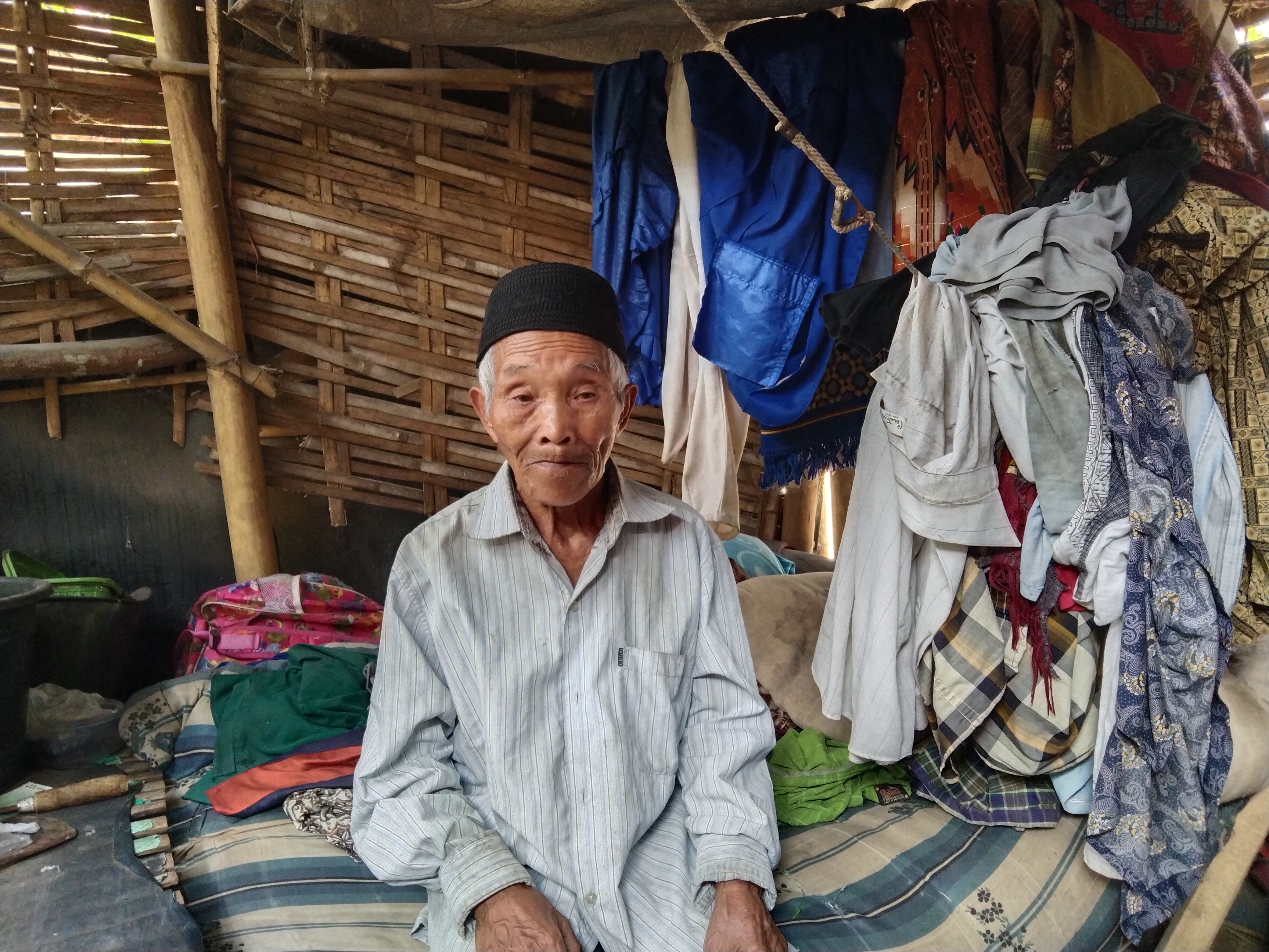 Saat ini kakek tinggal di gubuk kecil yang sudah reyot, berlubang dimana-mana dan hanya bisa kakek tambal dengan tikar bekas