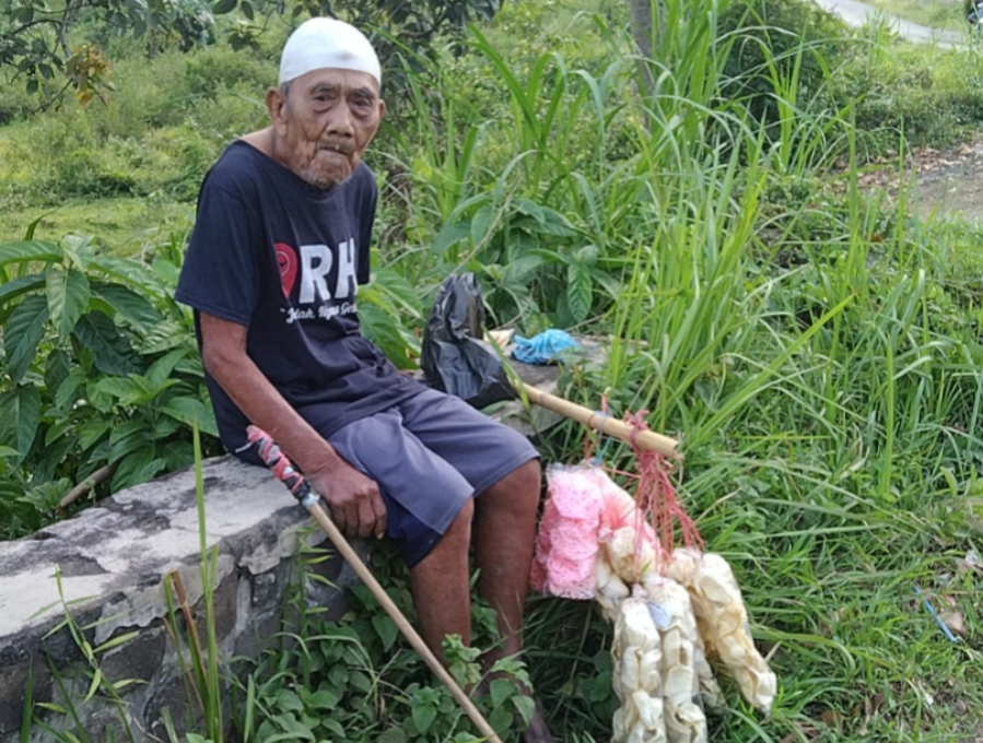 Aku samperin namanya Kakek QI (80) ia istirahat sambil nunggu pembeli, kakek jualan kerupuk.