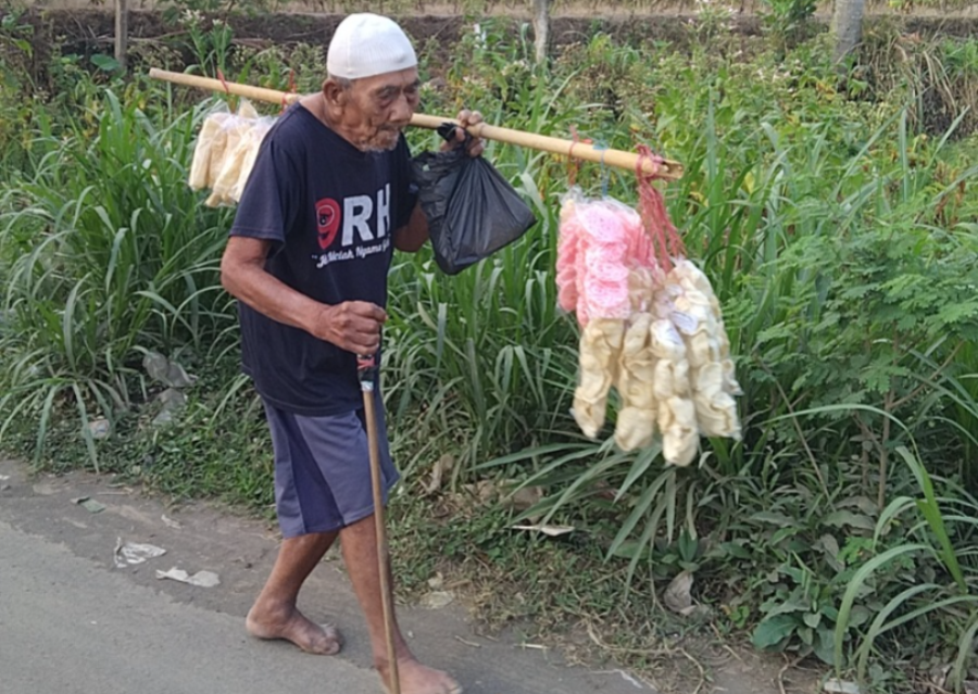 Upahnya itu kakek gunakan buat makan sehari-hari. Kakek cerita, sekarang ia tak bisa berjalan jauh kaki dan tubuhnya sering sakit, buat jalan pun kakek pakai tongkat sambil memikul kerupuk dan tanpa alas kaki.