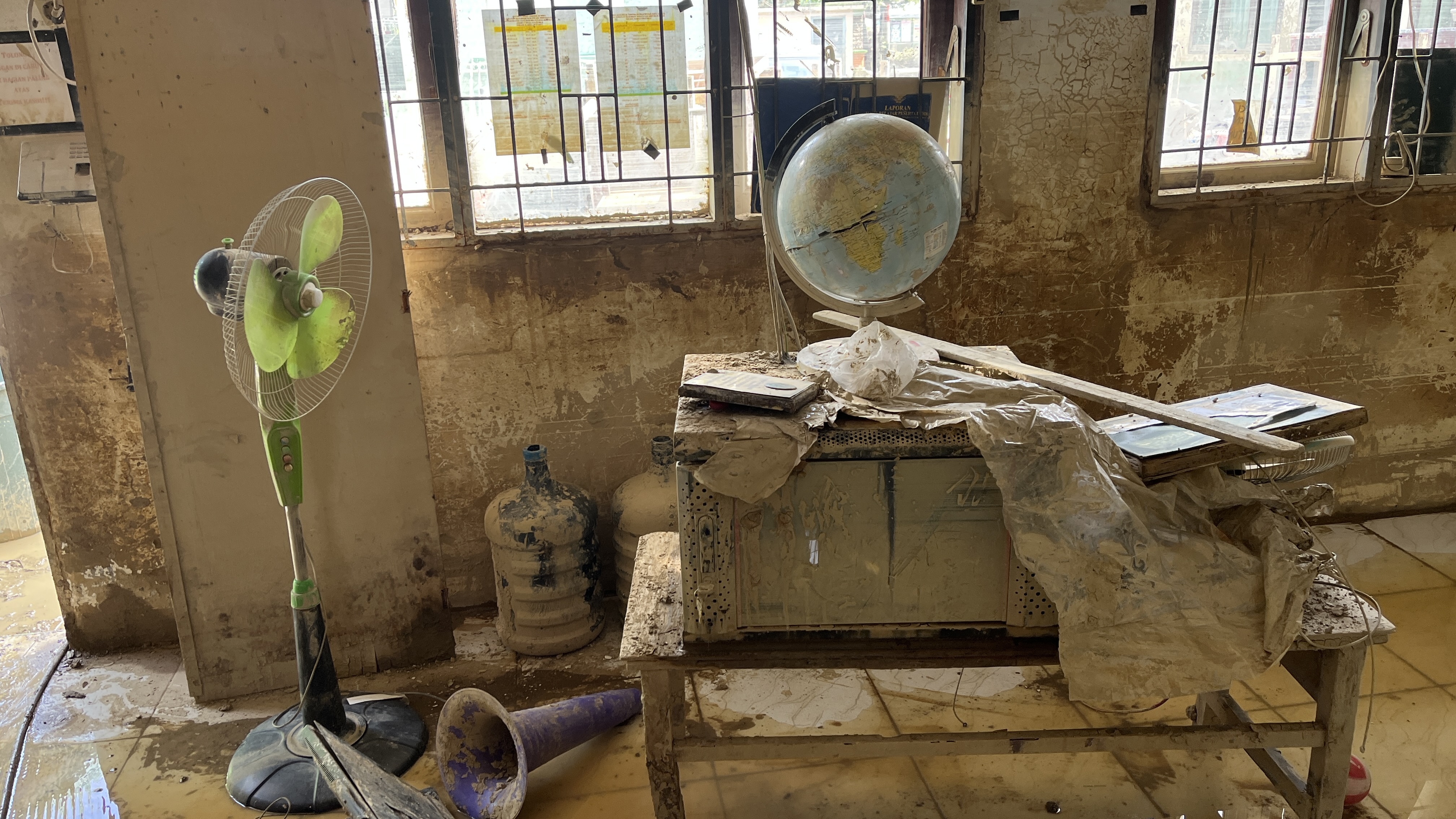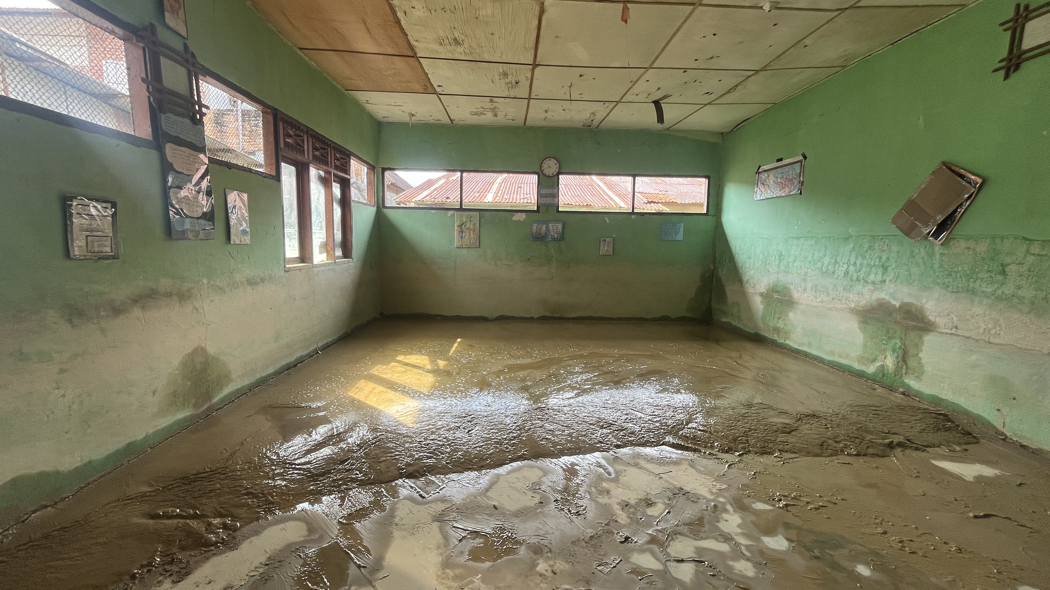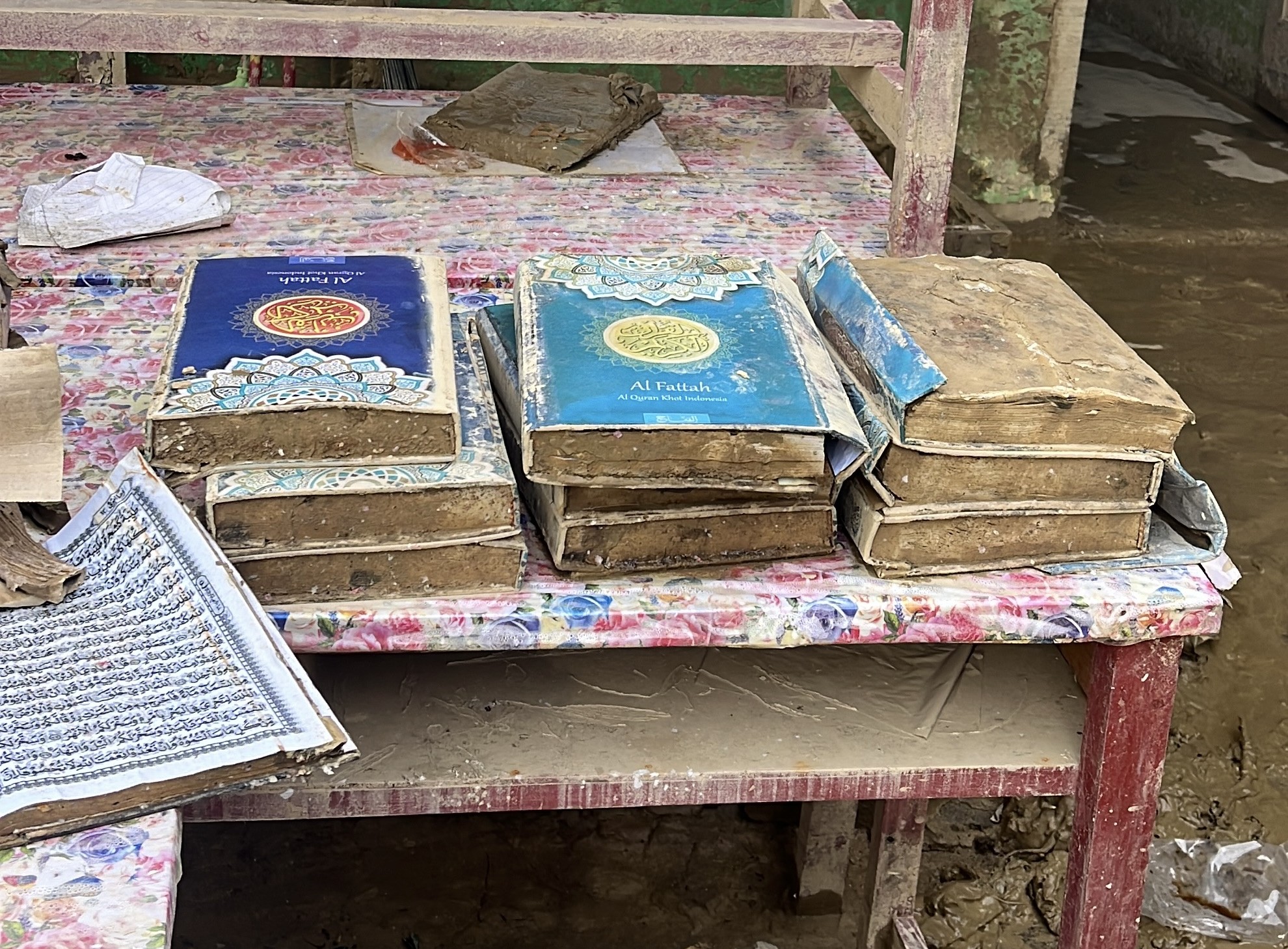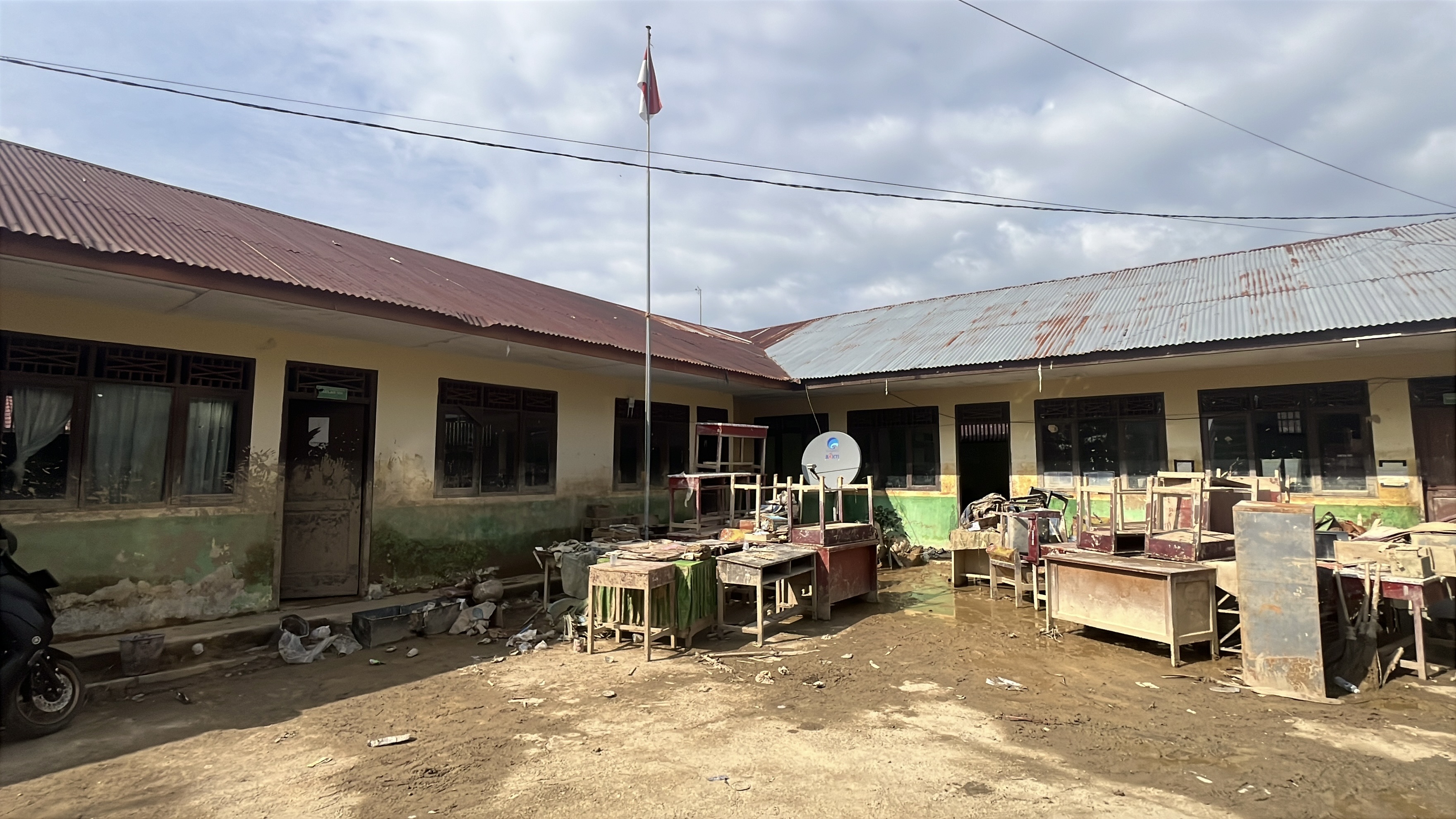 Bangku dan kursi tak lagi layak pakai, buku pelajaran rusak, komputer tidak berfungsi, bahkan Al-Qur’an ikut hanyut dan tak dapat digunakan kembali. Dari 4 ruang kelas dan 1 kantor sekolah, hingga kini masih ada 3 ruang kelas yang dipenuhi lumpur dan belum bisa digunakan.