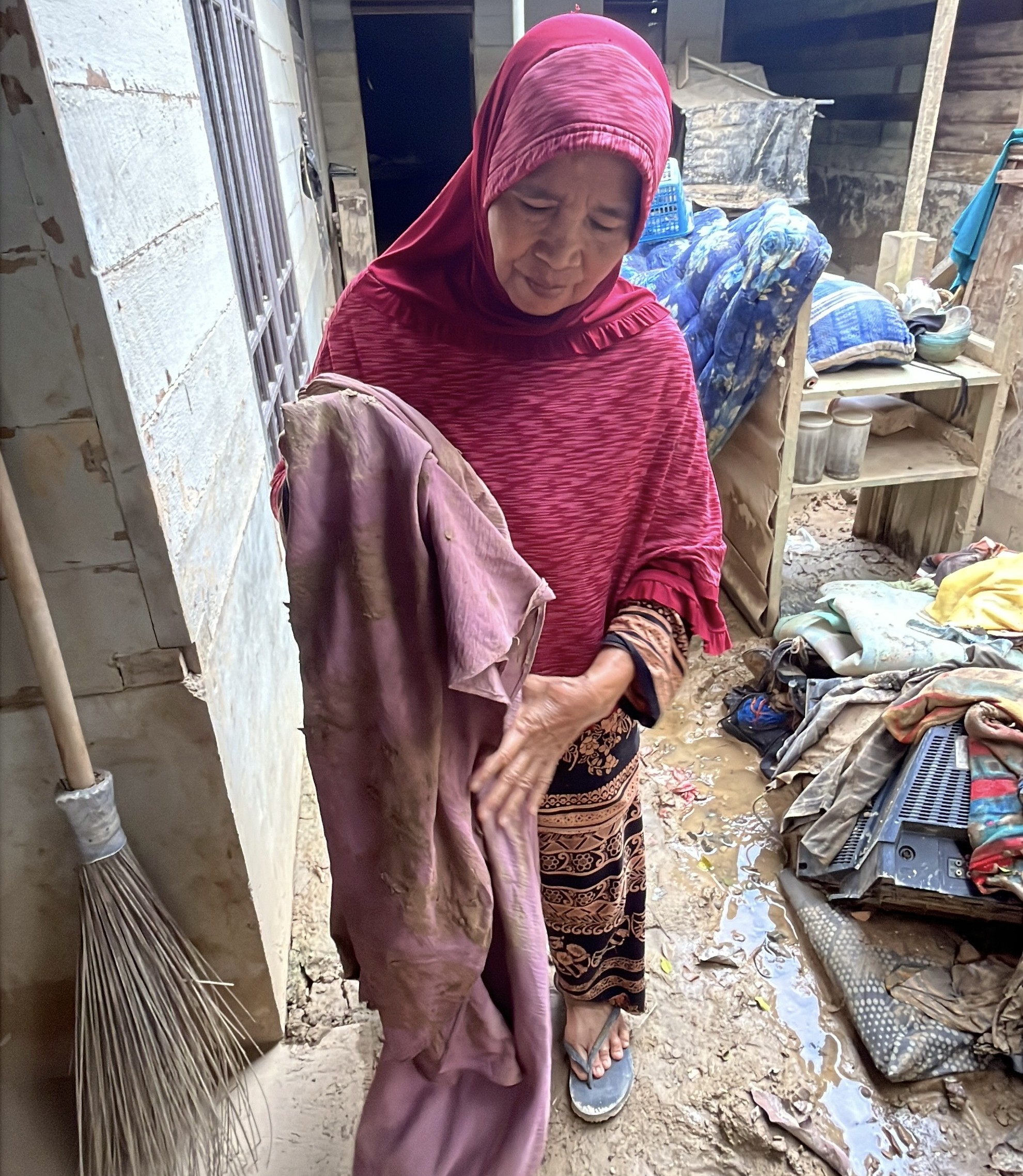 Hal serupa dialami Nenek Rubiah, nenek Fatiya, yang mukena satu-satunya terendam lumpur dan tidak bisa dipakai lagi.