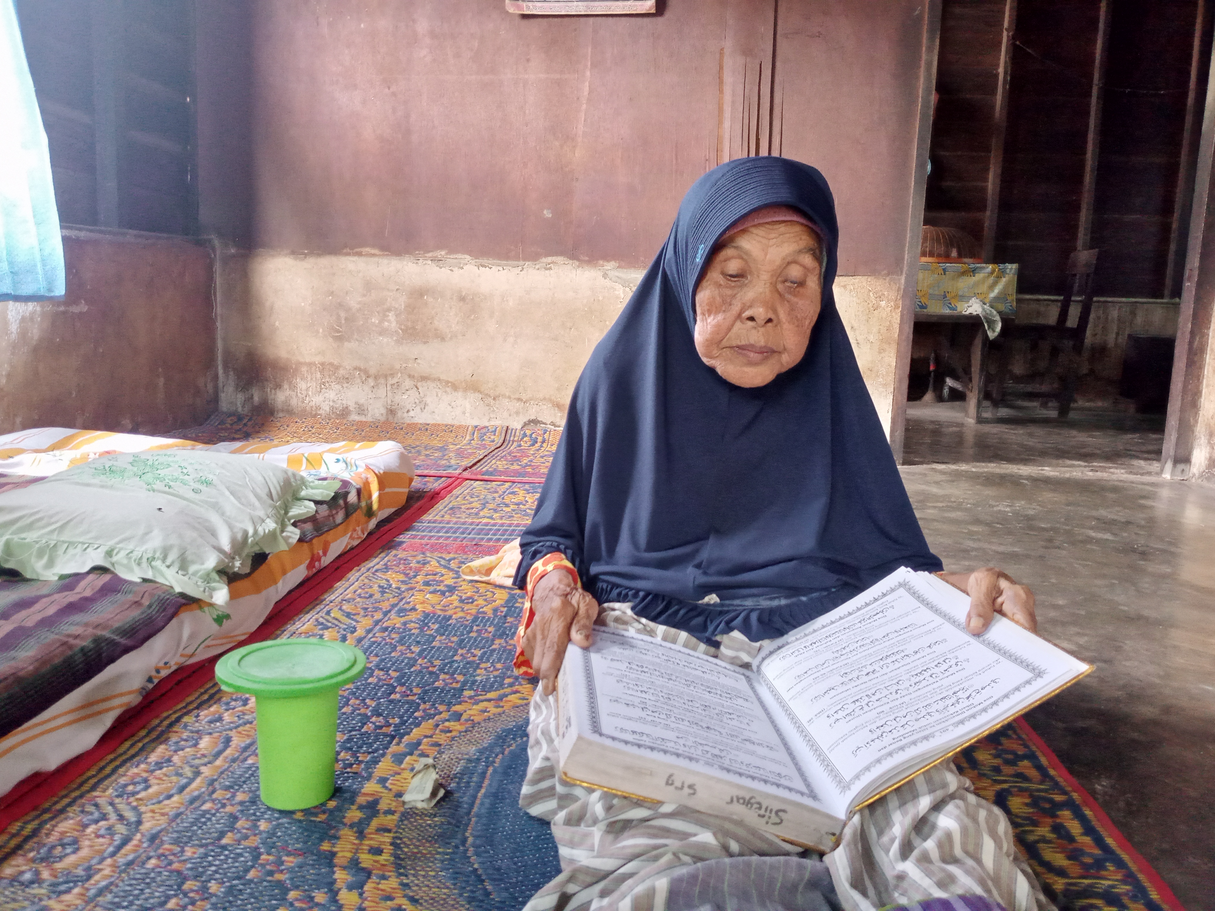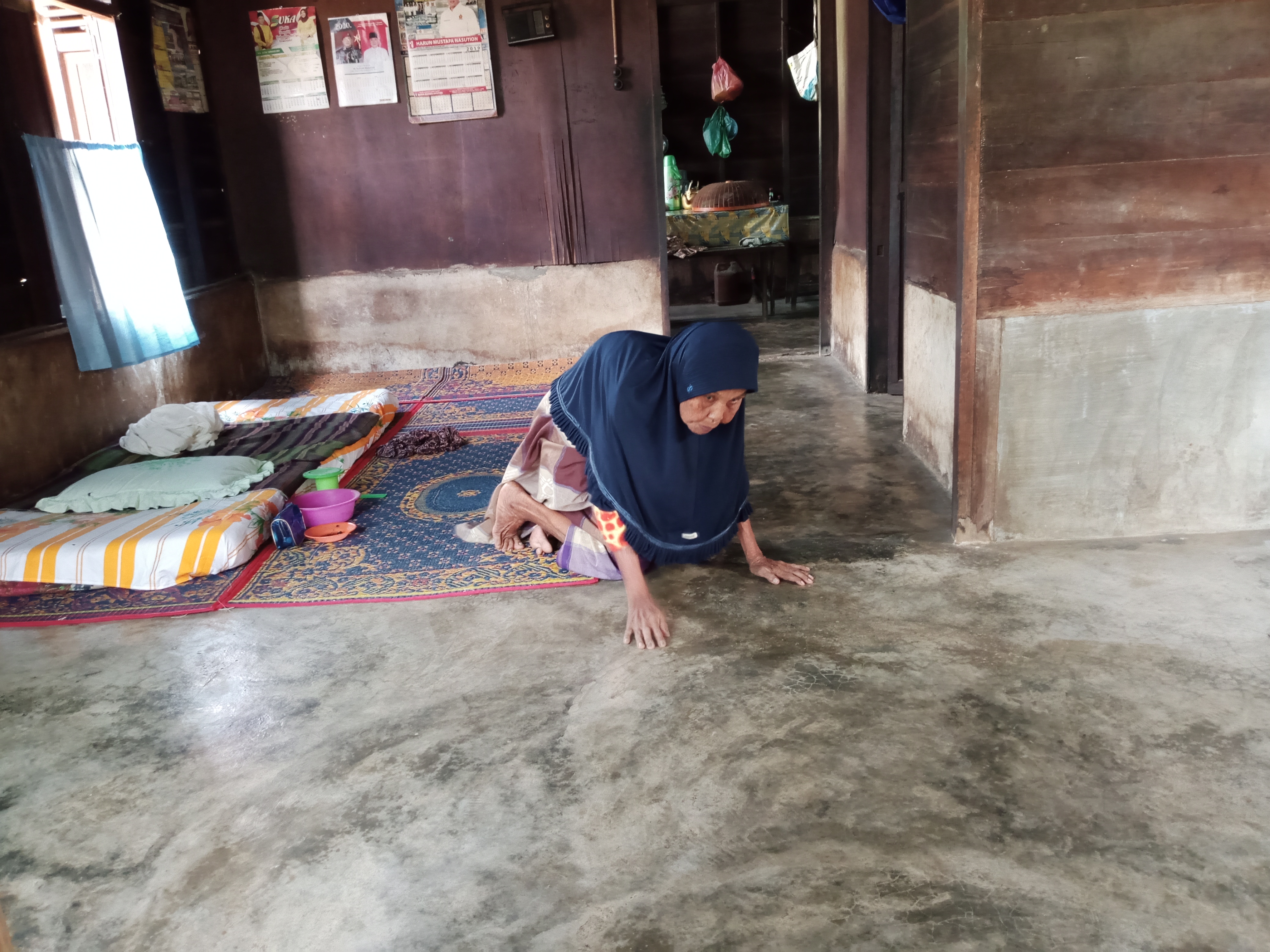 Nenek Arbiah mengalami kelumpuhan sejak satu tahun yang lalu akibat terjatuh di masjid saat sedang pengajian rutin. Kondisi kaki dan pinggangnya tak mampu lagi menopang dirinya ketika berdiri maupun berjalan. Alhasil, nenek hanya bisa merangkak jika ingin beraktifitas kemanapun.