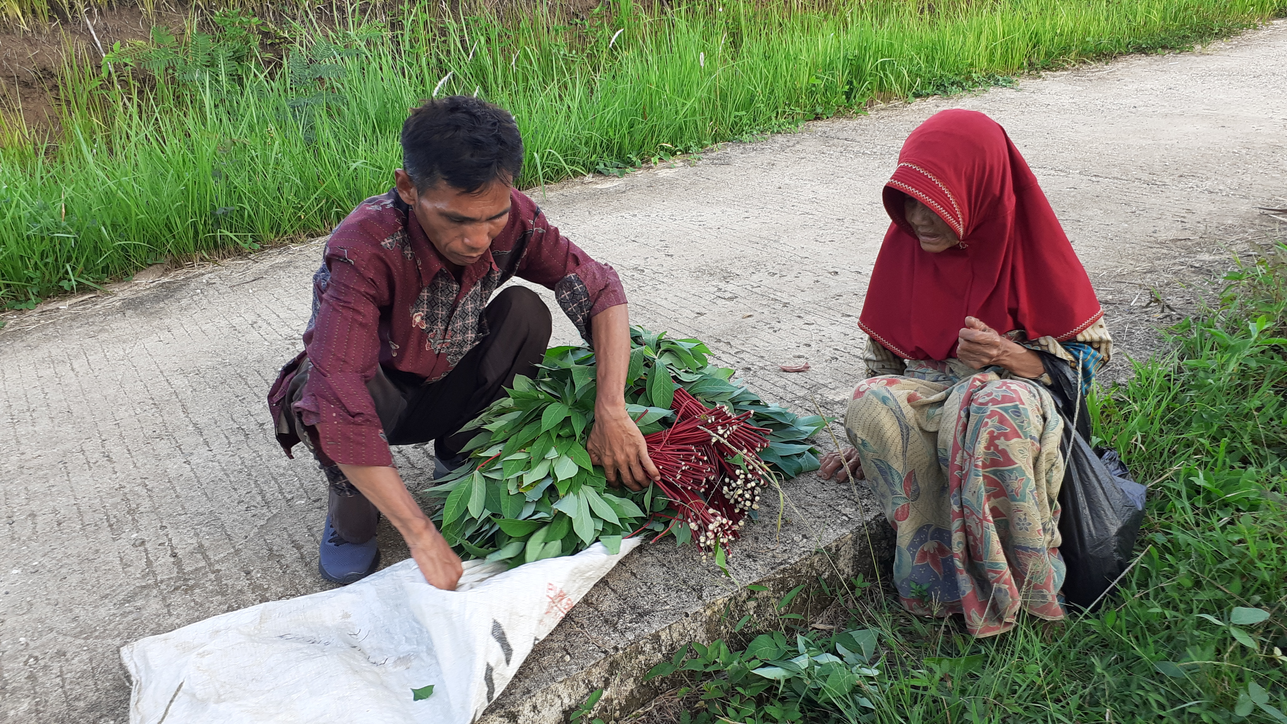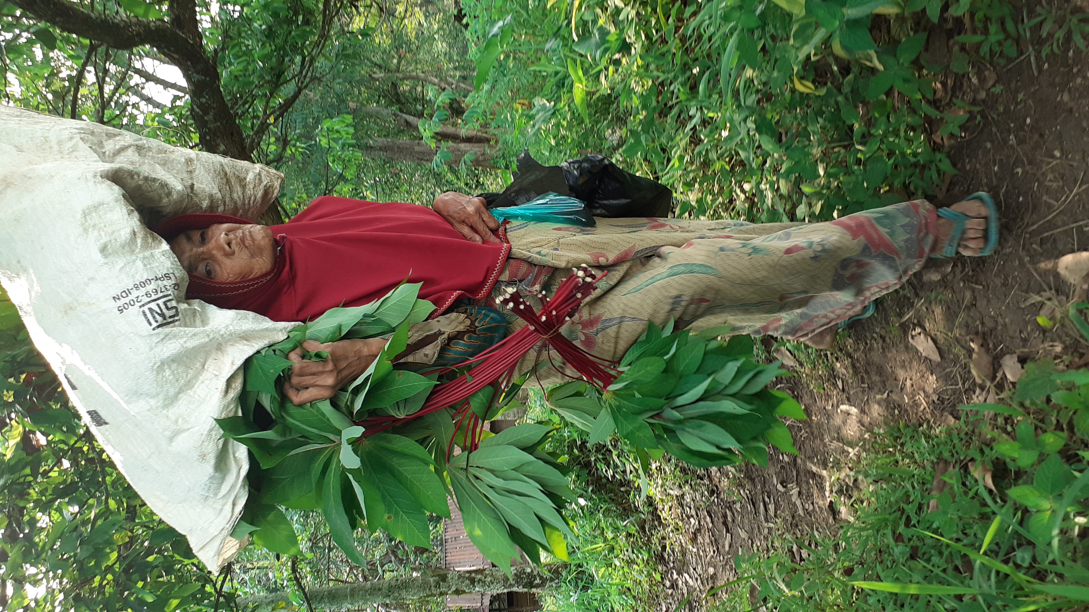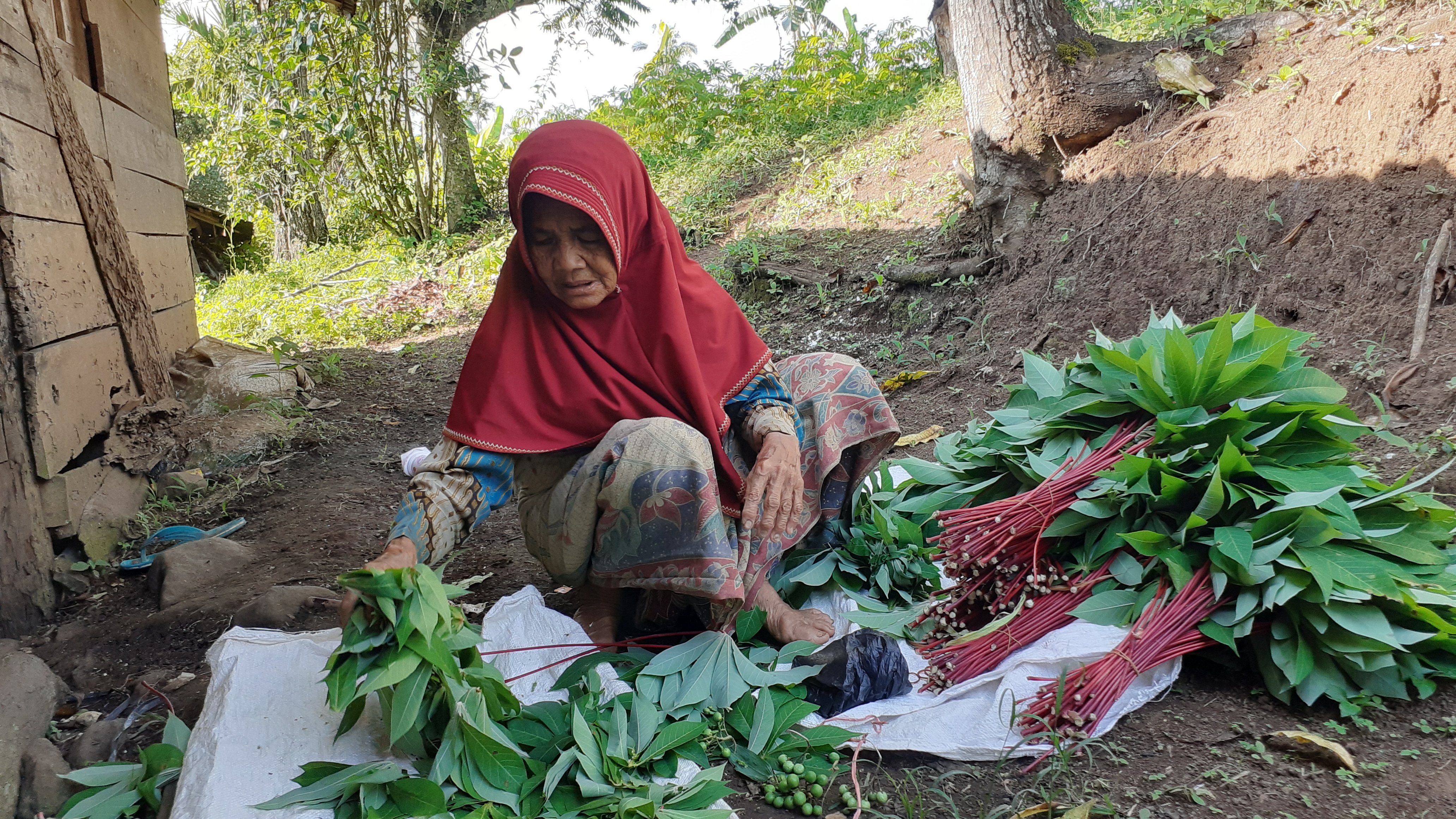 Sayuran yang dijual nenek seperti daun singkong,daun ubi dan daun pisang. Biasanya nenek berjualan di pasar, ia harus berjalan sejauh 10 km. Upah yang didapat hanya 20 ribu itupun jika sayuran yang dijual habis terjual.