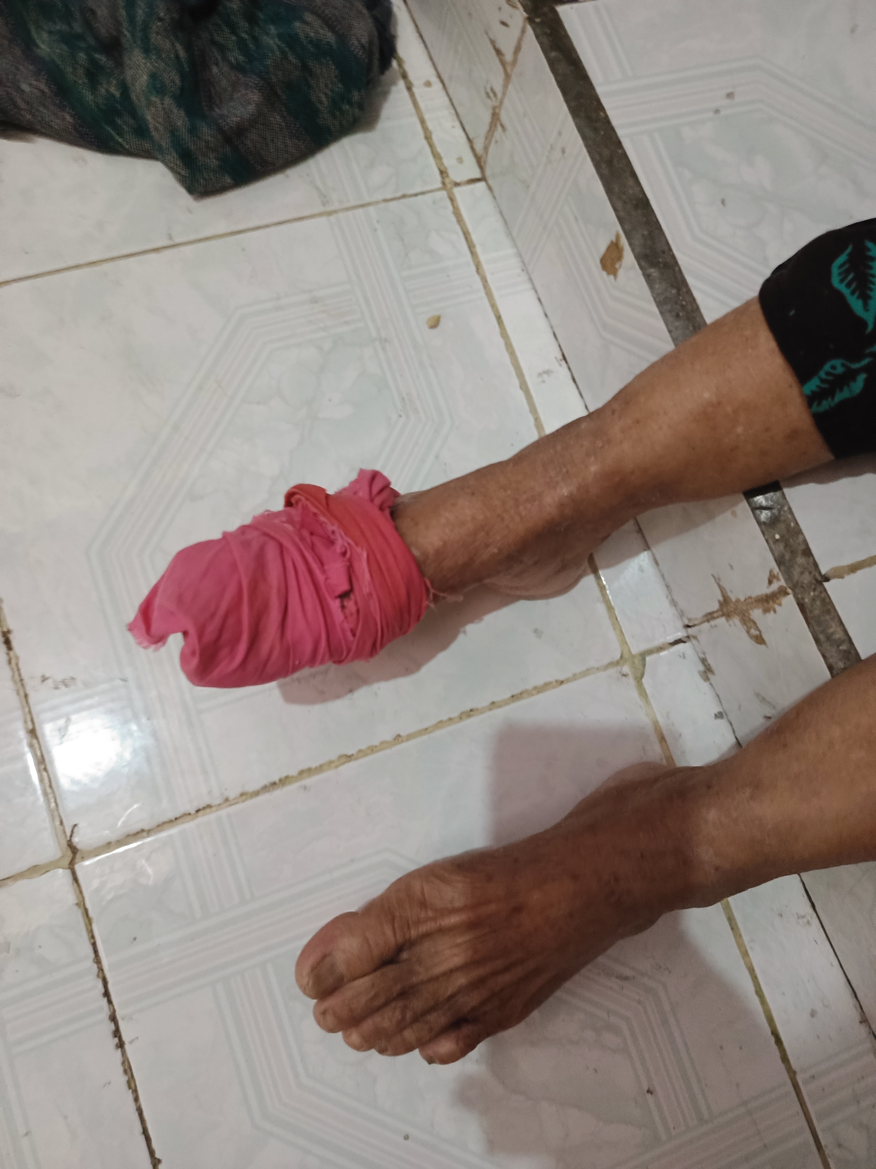 Nenek Supartik benar-benar sudah renta, sebelah matanya tak bisa melihat, tangannya kaku, bahkan kaki nenek luka hingga membusuk, nenek idap penyakit diabetes akut tapi tak ada biaya untuk berobat.