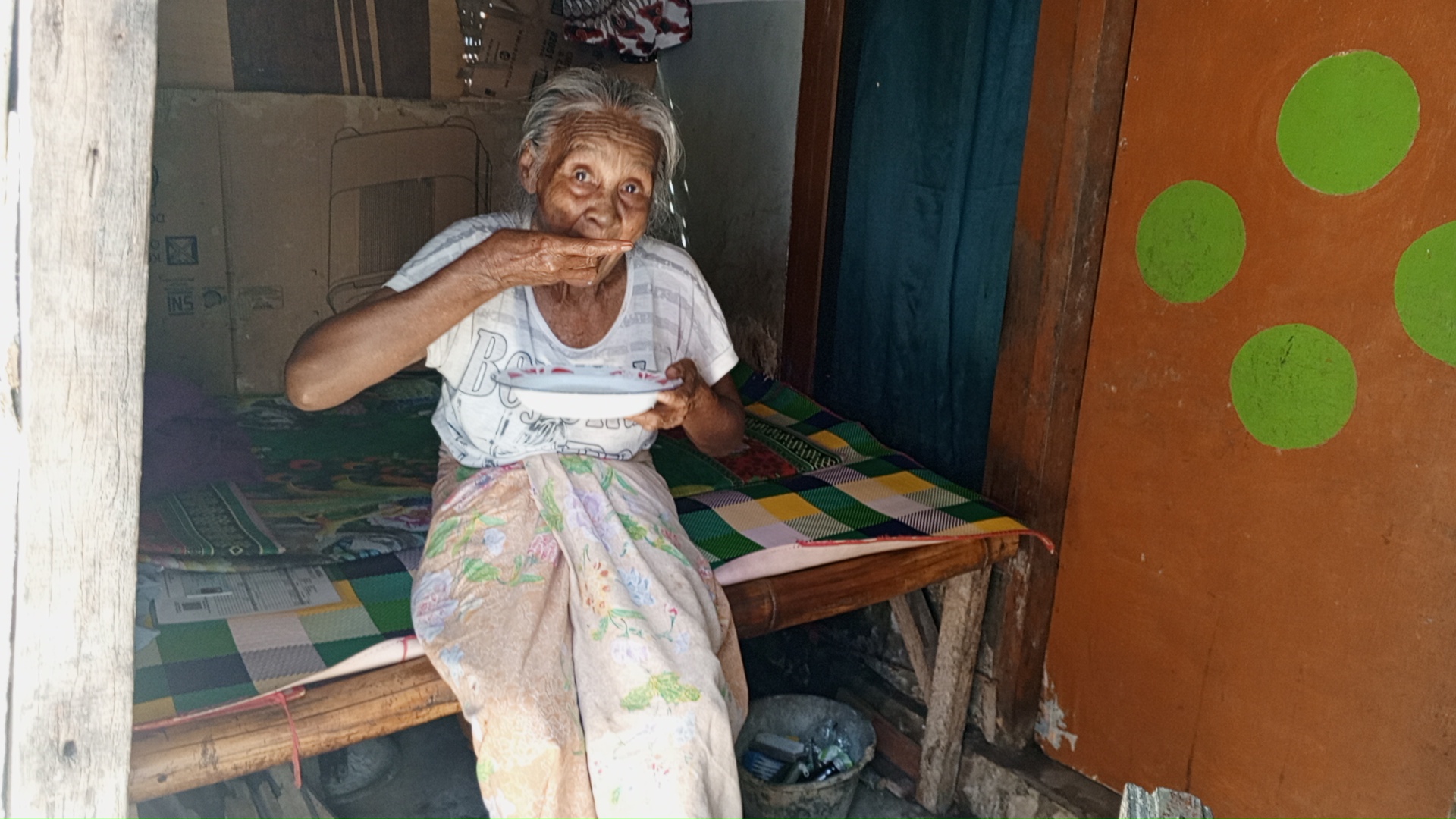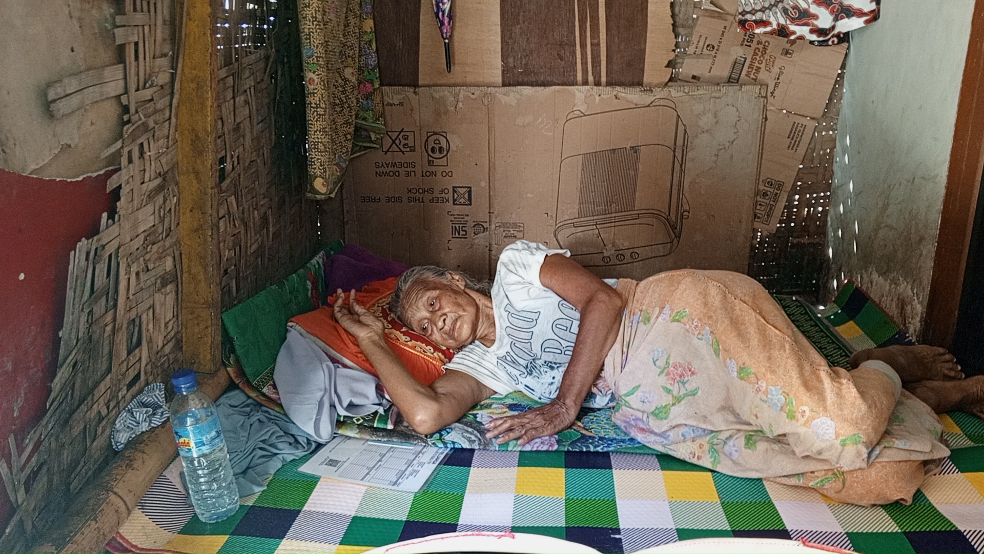 Sendirian di rumah yang kondisinya tak layak, hanya terbuat dari bilik bambu, celah yang berlubang nenek tutup pake kain agar tak bocor. Rumah nenek pun tak memiliki MCK.