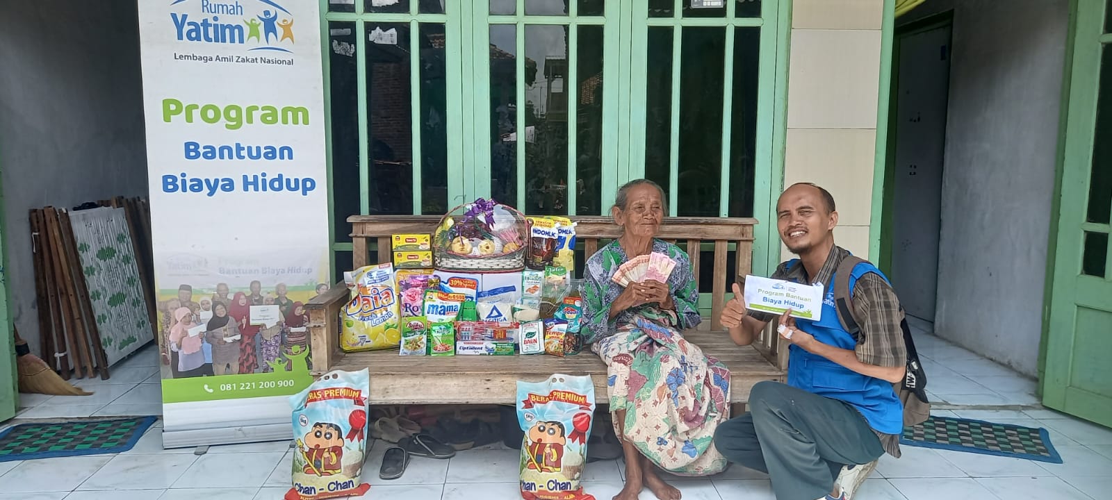 Bantuan yang diberikan adalah bantuan biaya hidup berupa beras, minyak, terigu, gula, garam, susu, teh, buah-buahan, kecap, saus, sabun, sampo, pasta gigi dan uang tunai sebesar Rp 4.015.000,-guna membantu kebutuhan sehari hari lainnya.