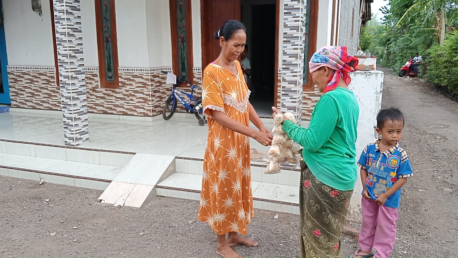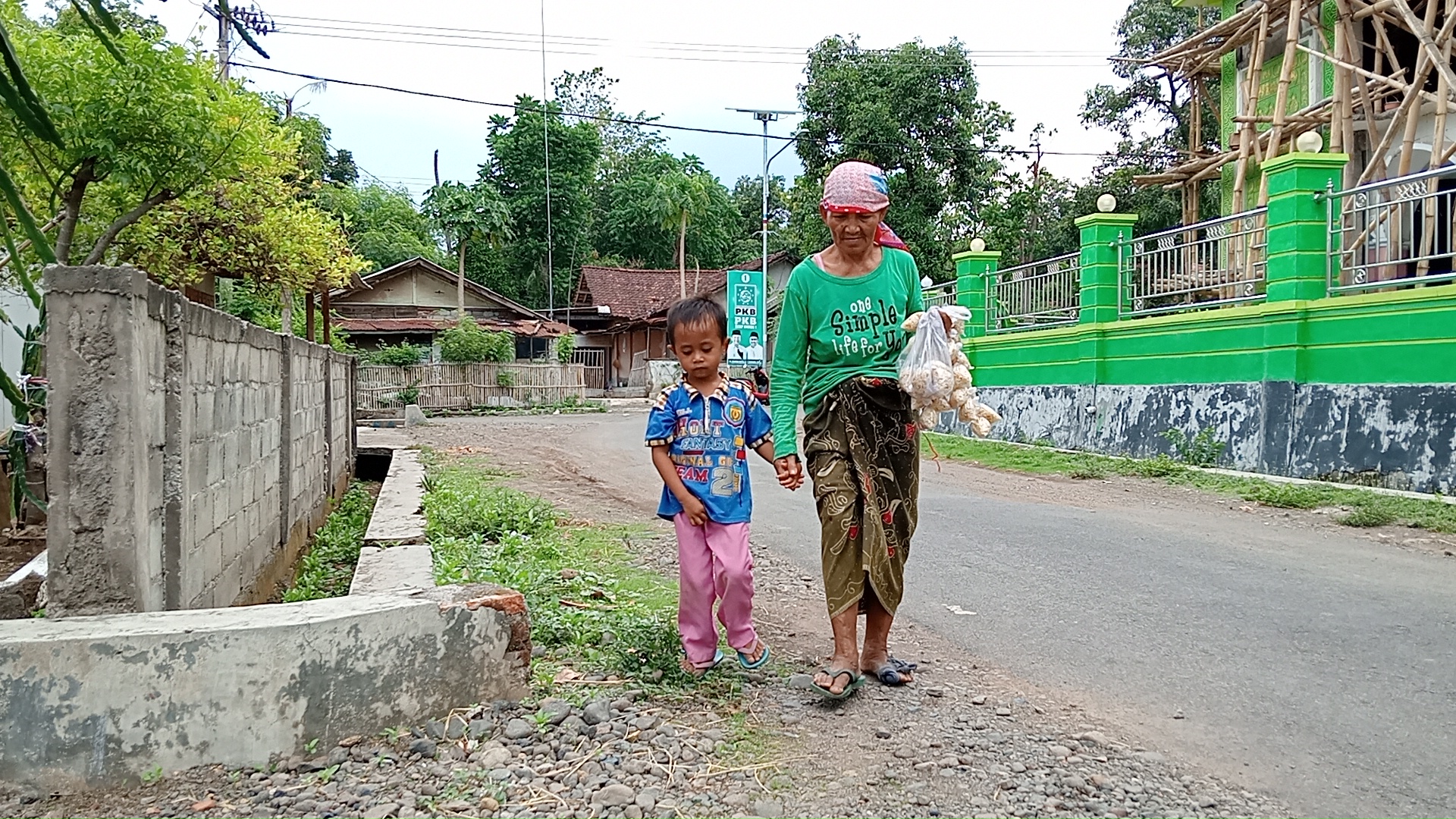 Setiap hari nenek dan cucunya berjalan sekitar 5 km menawarkan cangkarok yang dijualnya kepada orang yang ditemuinya.