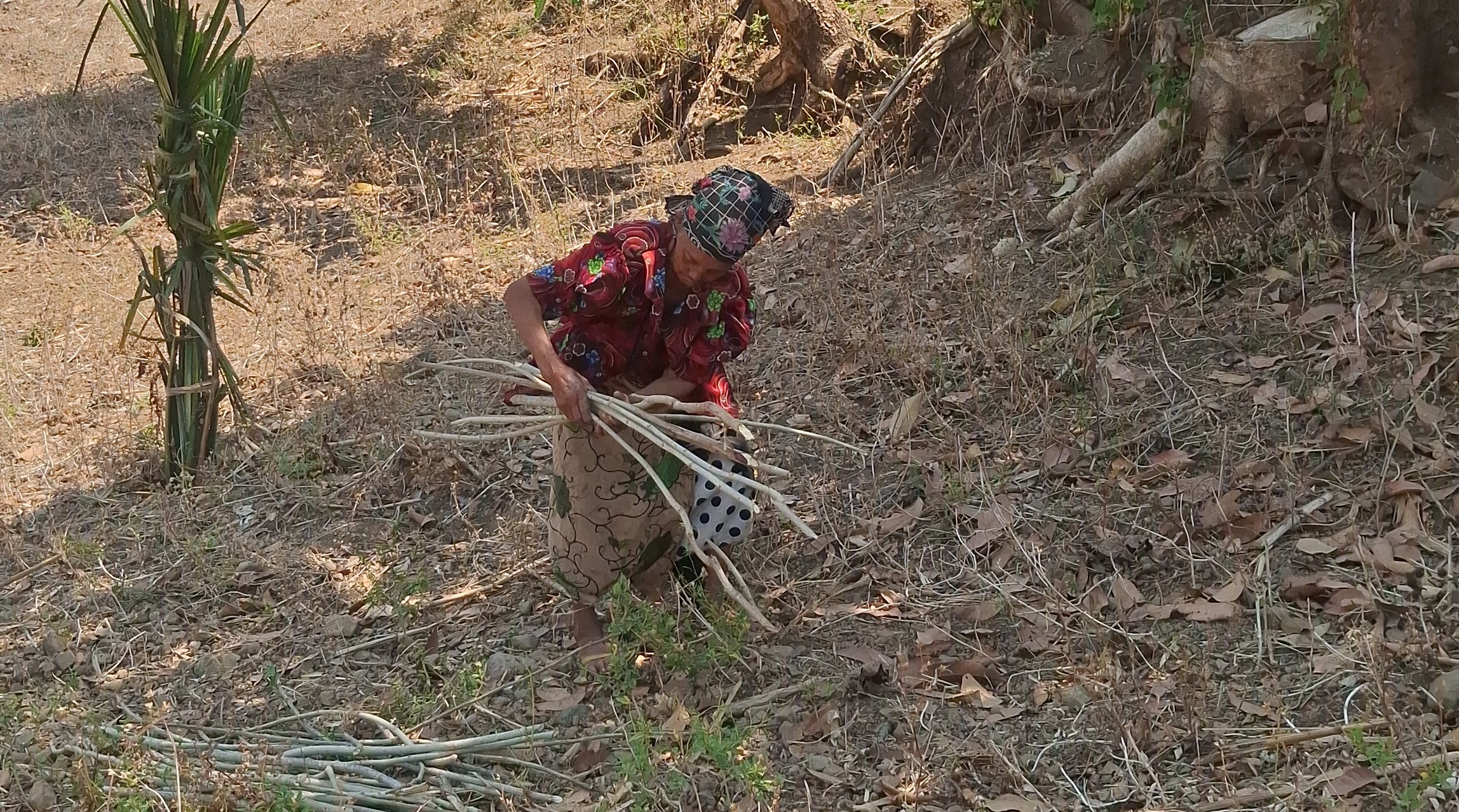 Dengan sabit kecil di tangan, Nek Misnati memunguti ranting-ranting kering yang berserakan di hutan, lalu mengikatnya rapi menjadi beberapa ikatan besar yang akan ia jual.