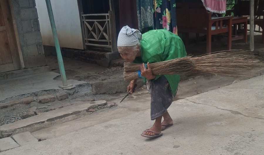 Di usia 83 tahun, Nek Surat masih menyusuri jalanan desa dengan langkah perlahan. Tubuhnya sudah kian membungkuk dan sering kelelahan.