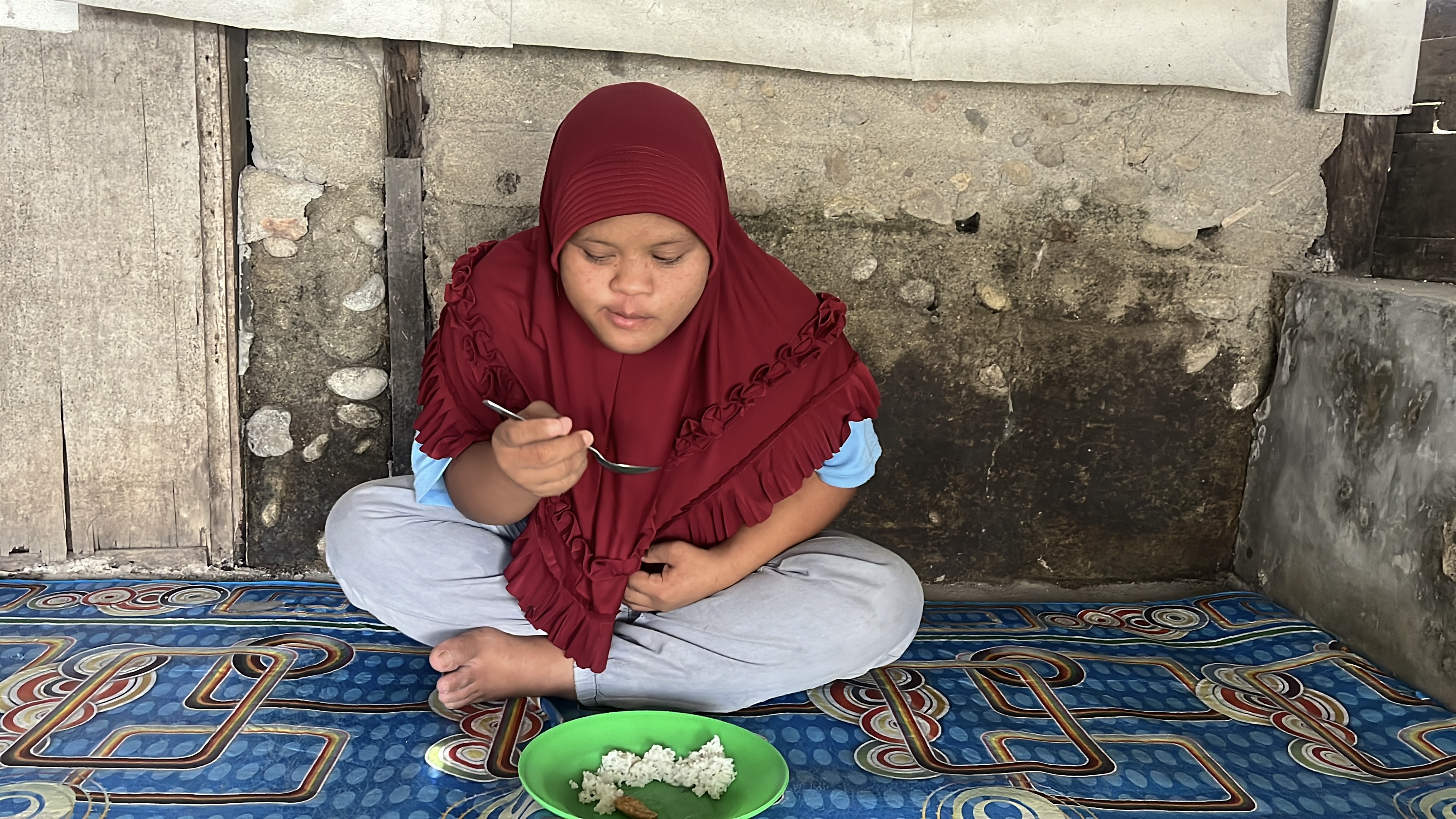 Begitulah ucapan pertama dari anak penderita Down Syndrome ini. Namanya Nur (18). Ia berjuang demi bisa makan setelah ayahnya tiada.