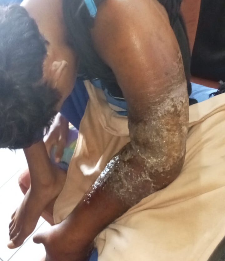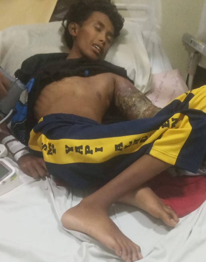 Kini kondisinya semakin mengkhawatirkan. Tangan Nurhapidin membesar tidak wajar, terdapat luka yang terus mengeluarkan nanah, dan rasa sakit membuatnya tidak bisa tidur berbaring.