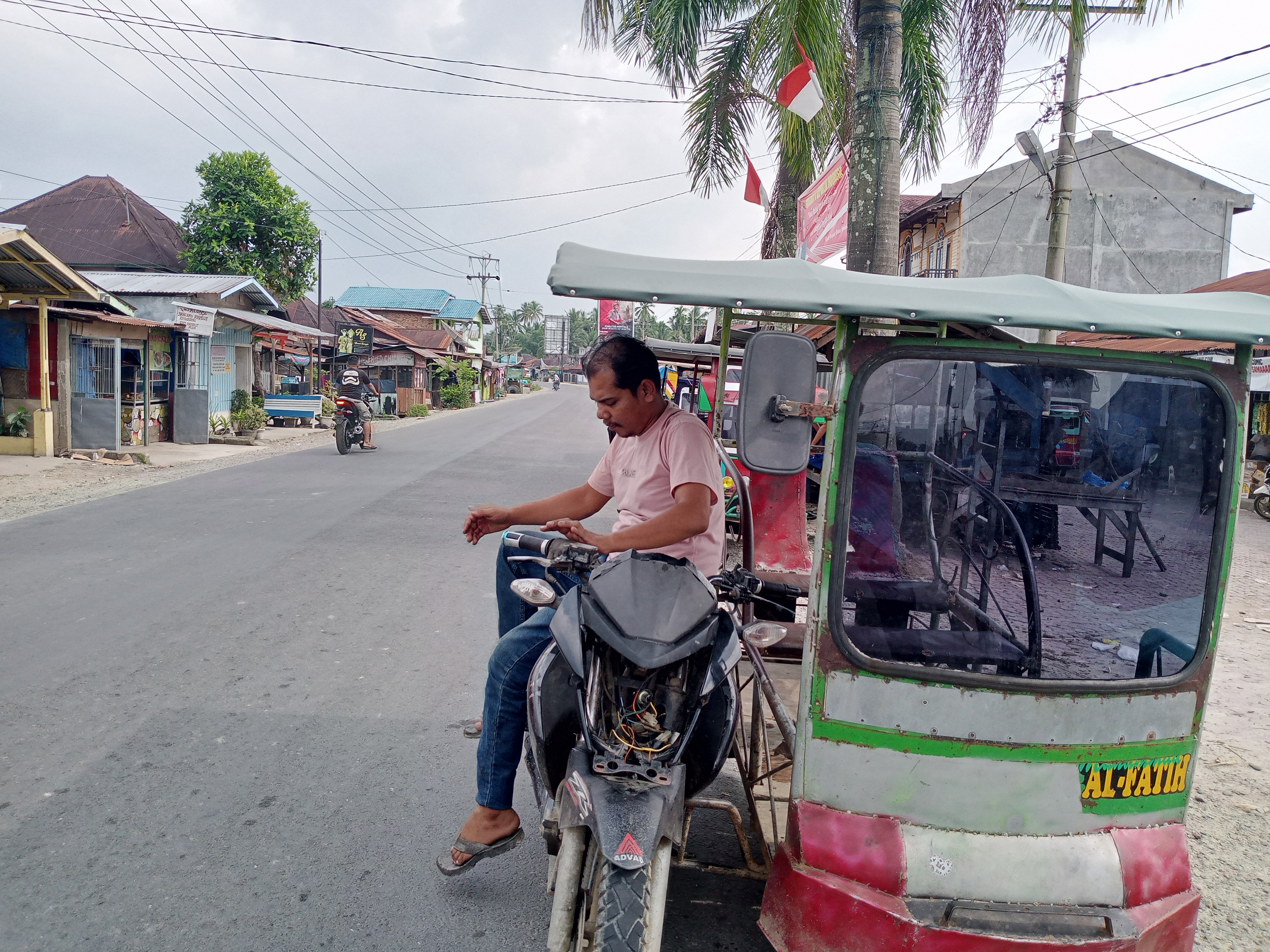 Setiap hari pak Adi menjadi tukang becak motor. Becak yang dipakainya ia sewa 30 ribu/harinya. Belum lagi ia harus mengisi bensin.