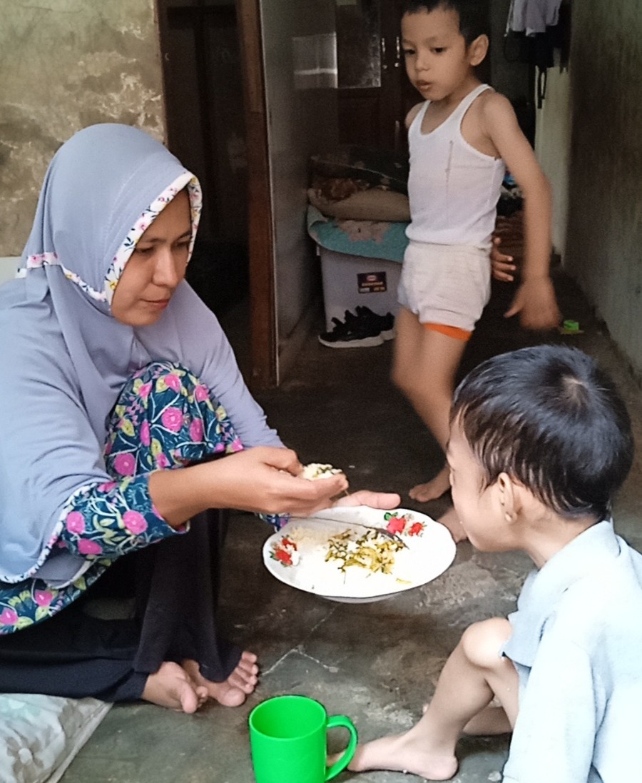 Dari empat anak, dua bersekolah di Sekolah Luar Biasa (SLB) dan anak ketiga (Thoriq) tak bisa sekolah karena menderita Epilepsi dan Cerebral Palsy. Setiap hari, ia hanya berbaring dan aktifitas di bantu ibunya.
