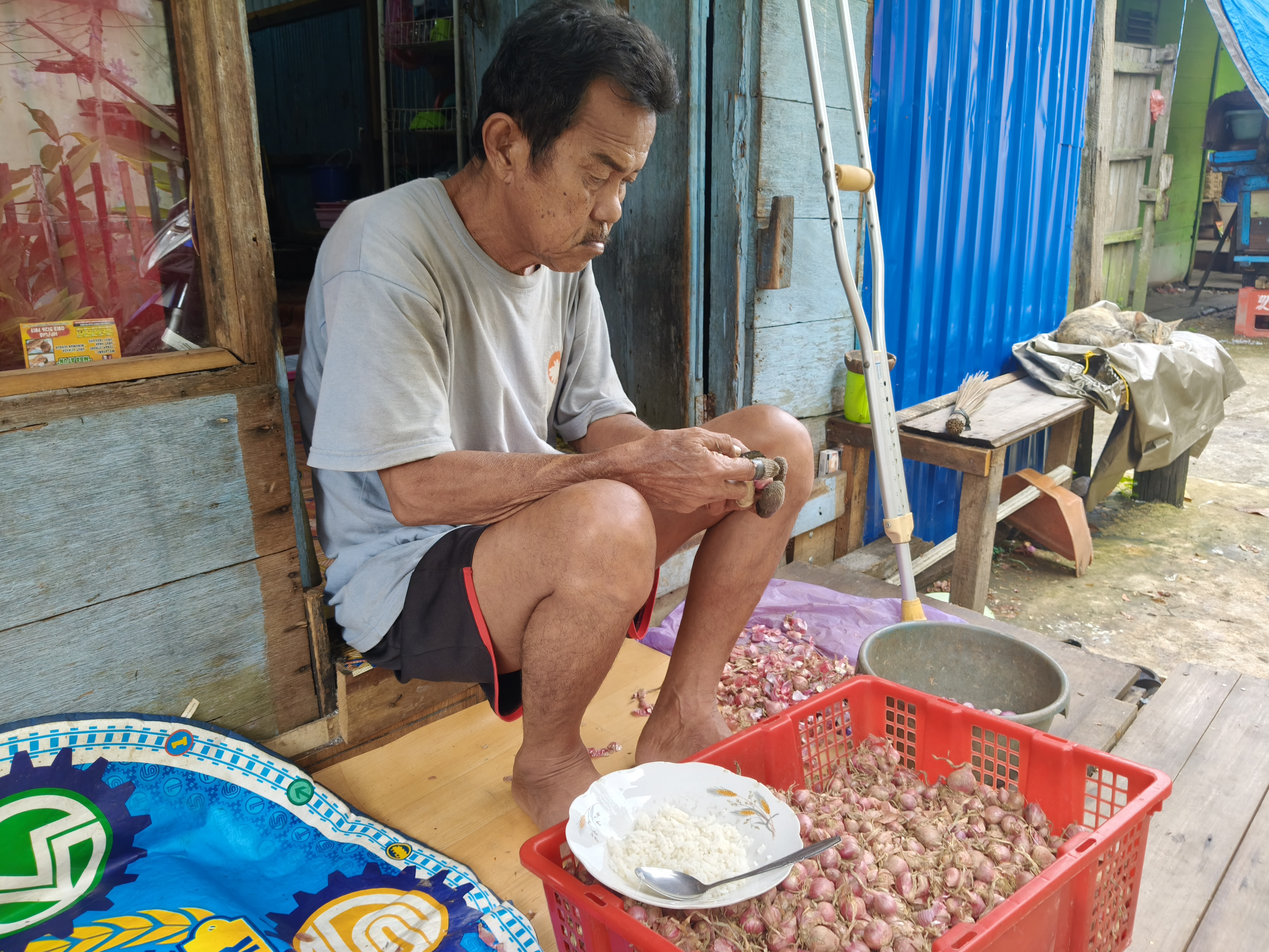 Dulu ia masih bisa bekerja menjadi tukang parkir, namun sekarang menjadi buruh pengupas bawang.
