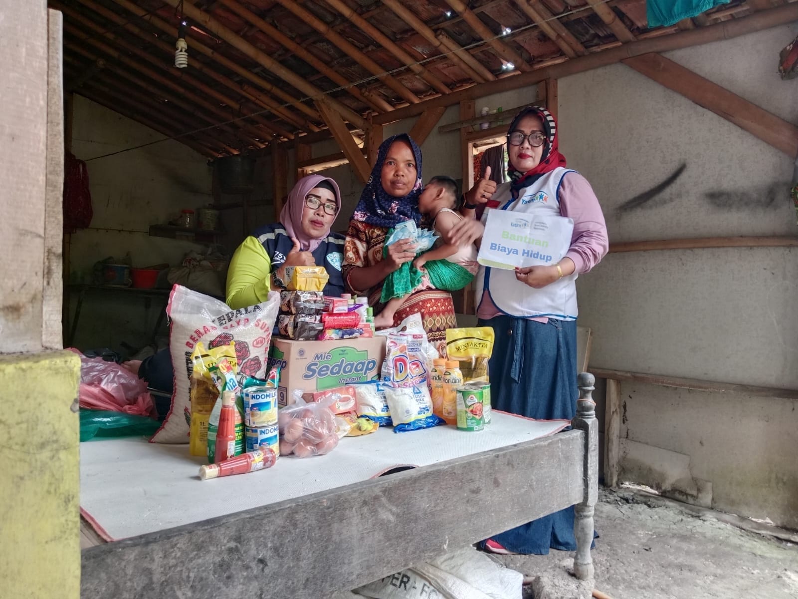 Bantuan yang diberikan adalah bantuan biaya hidup berupa sembako seperti minyak, beras, terigu dan lain nya, tak hanya itu, tim kami juga memberikan bantuan berupa uang tunai guna membantu kebutuhan sehari hari lainnya.