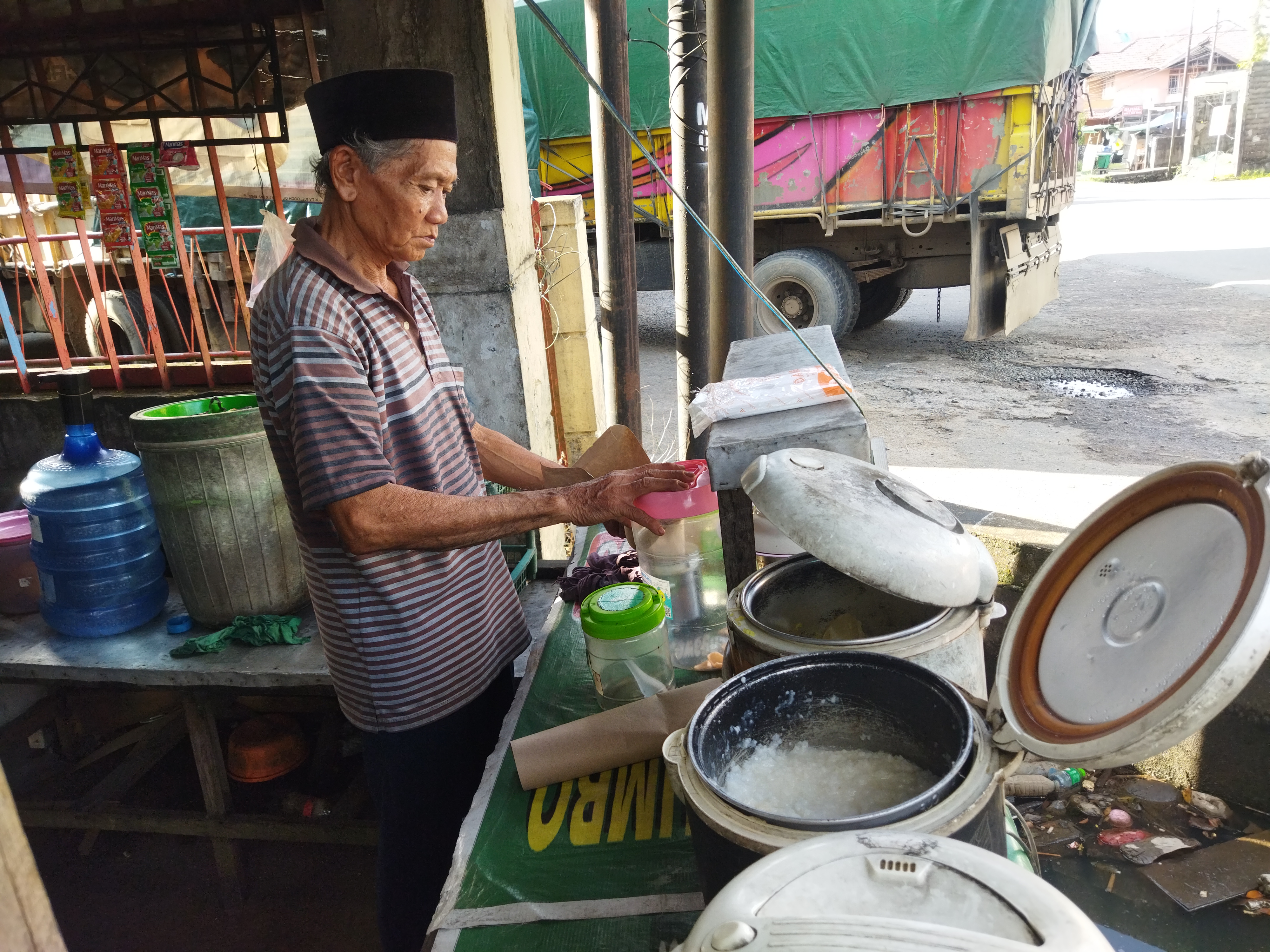 Pak Djaminan (70) dengan tangan renta, beliau menyiapkan bubur dan nasi kuning untuk dijual demi bisa bertahan hidup. Sambil mendorong kursi roda sang istri, Ibu Sutilah (68).
