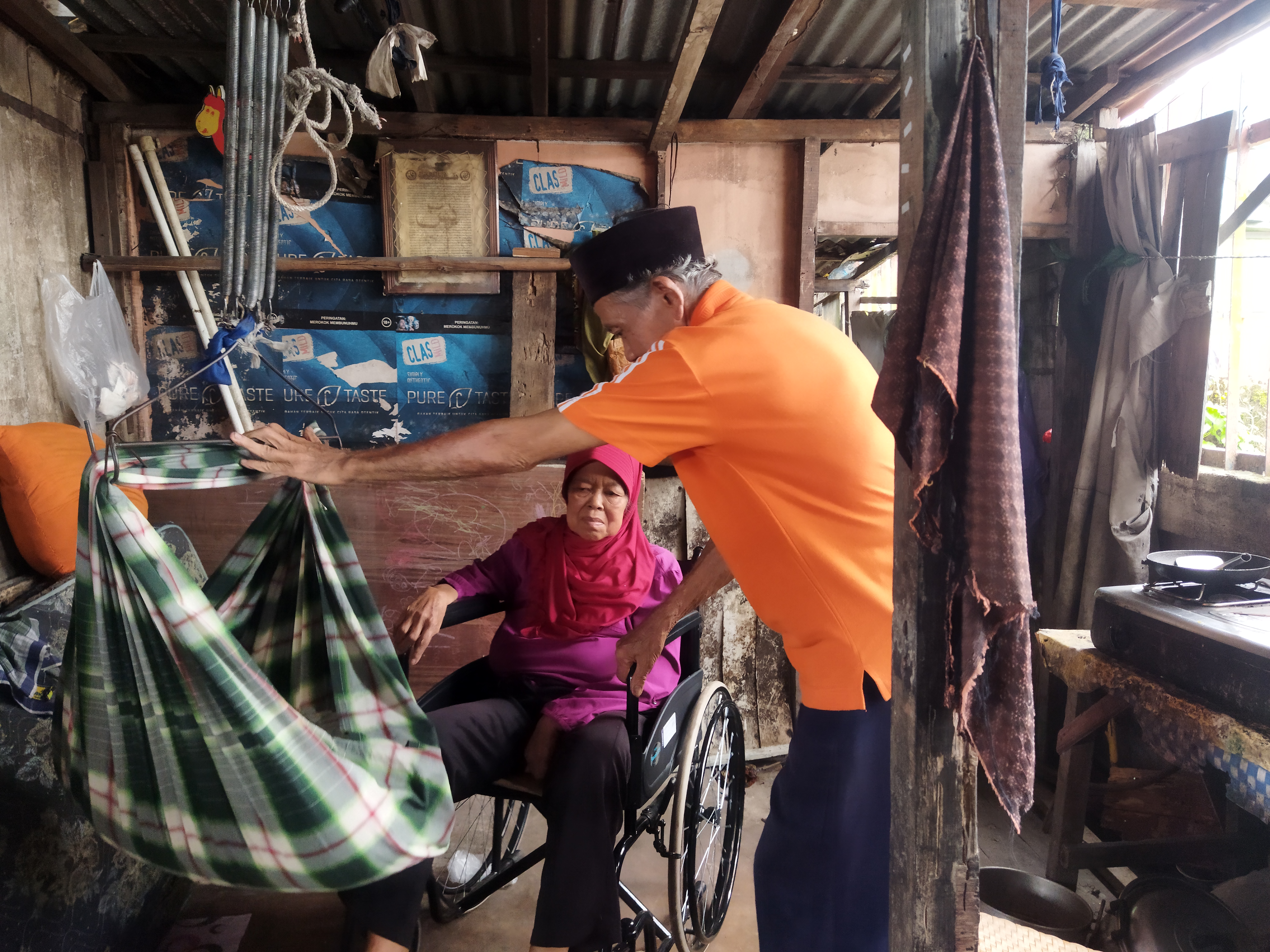 Ibu Sutilah, yang kini hanya bisa duduk di kursi roda akibat stroke, tak pernah mau jauh dari suaminya.