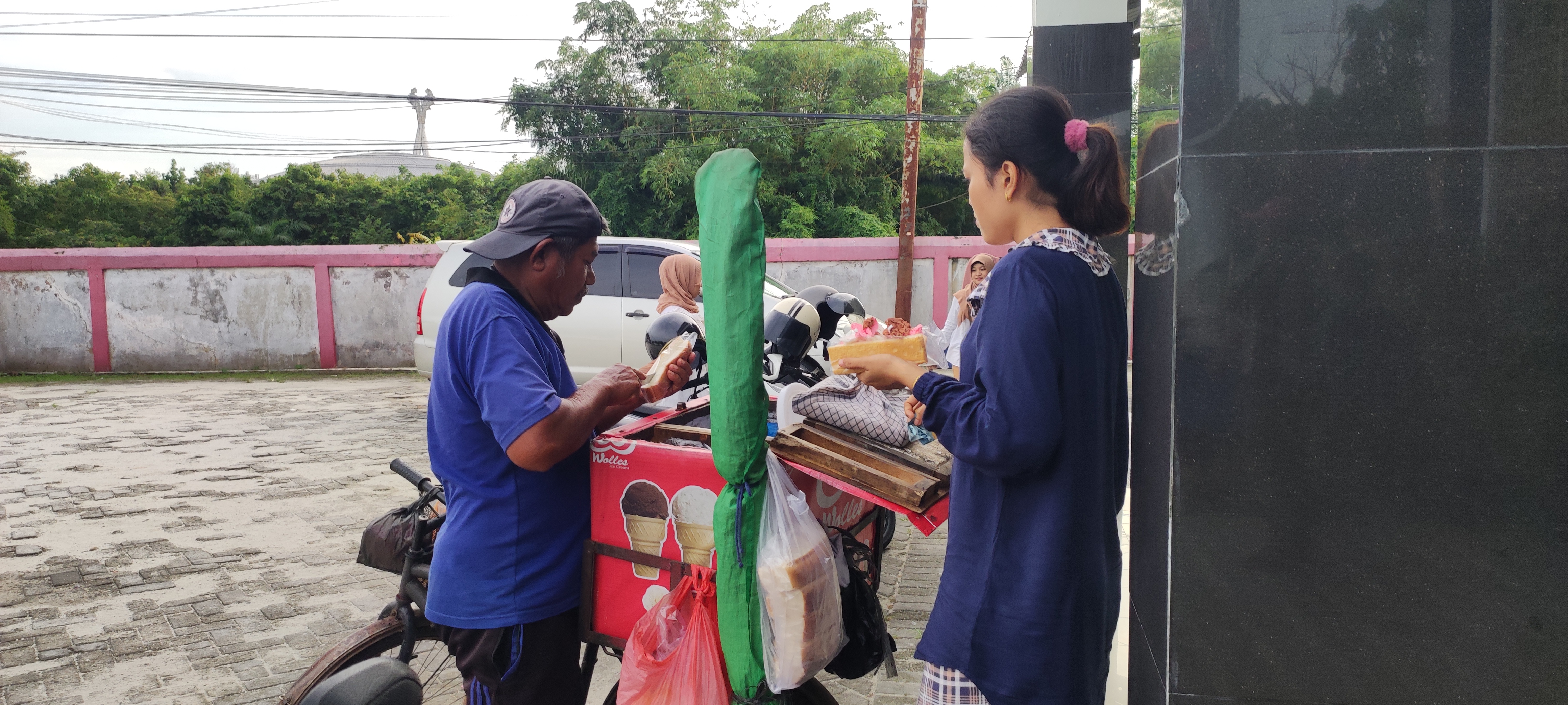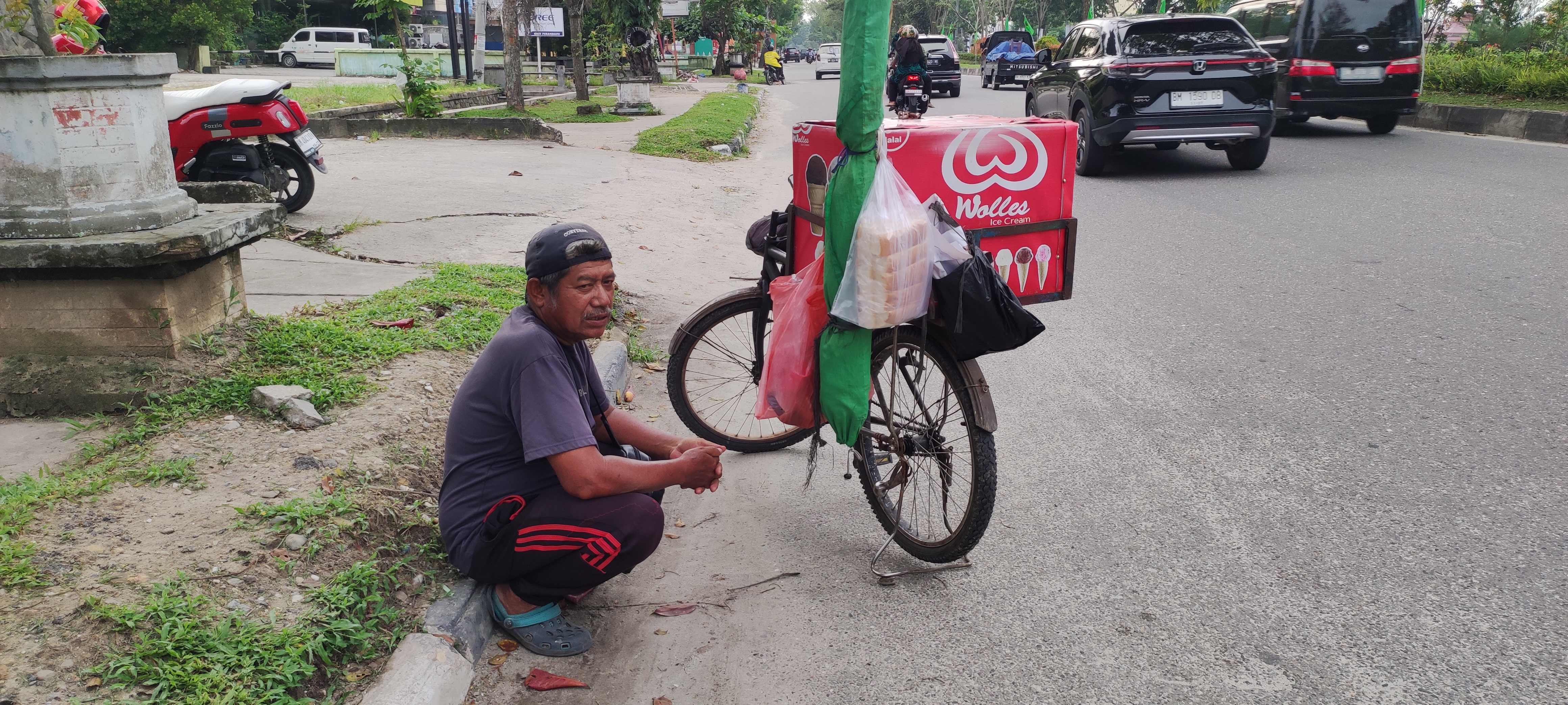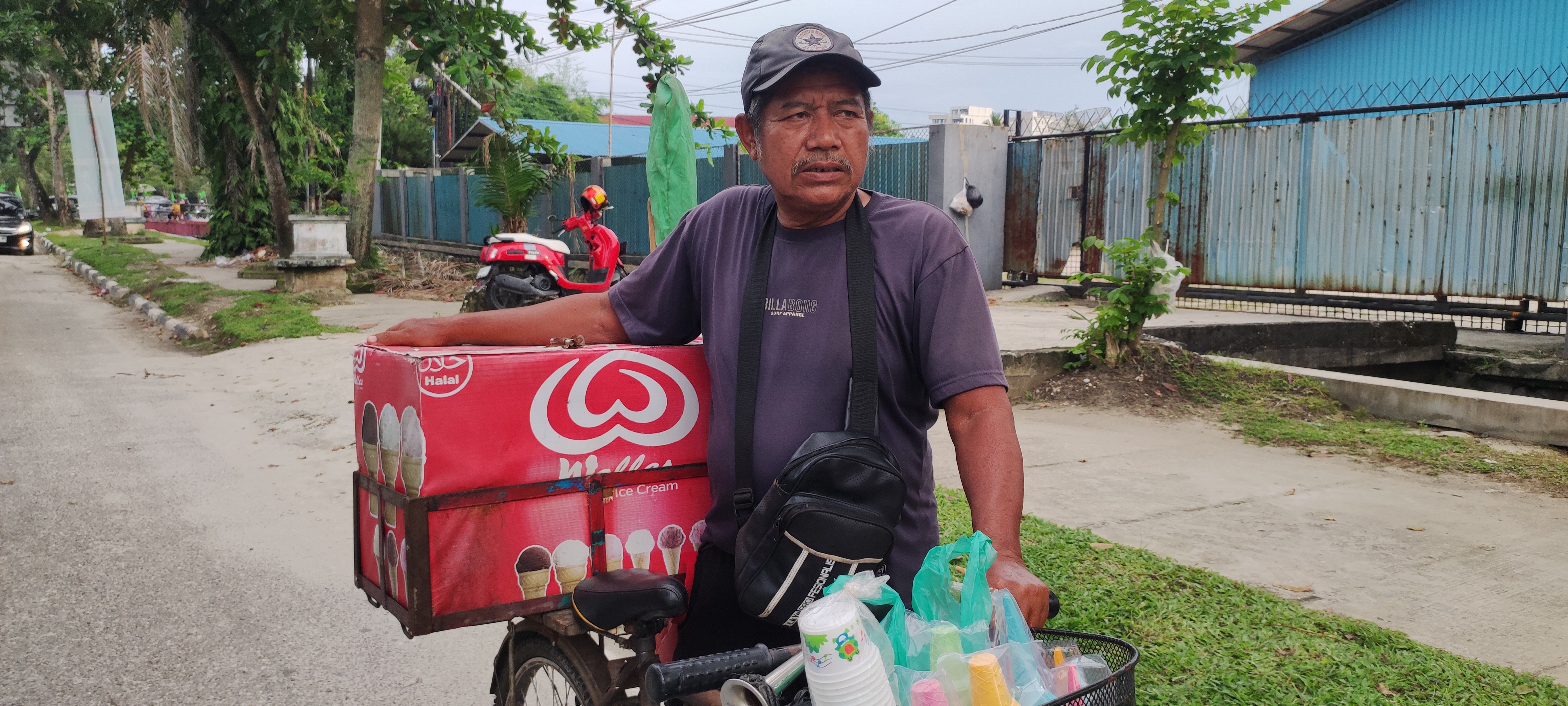 Pak Drawizal cerita kalau ia keliling jualan dari pagi sampai sore namun, seringkali ia harus menahan lapar saat berjualan karena tak ada es krim yang dijual nya belum ada yang beli.
