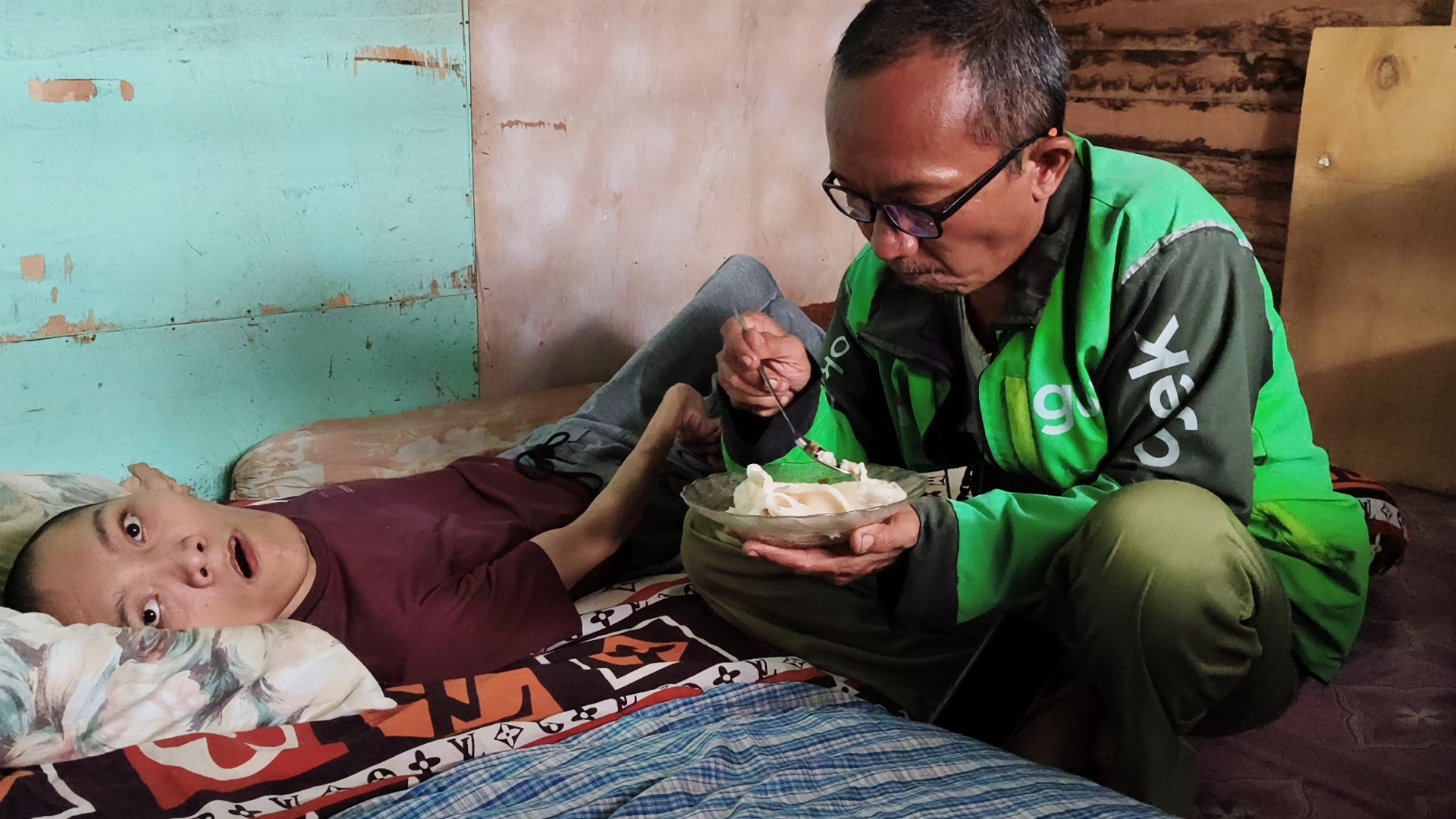 Setiap hari Pak Chandra mencari nafkah dengan menjadi pengemudi ojek online. Ia harus bertahan demi anaknya yang telah 25 tahun hidup dengan Cerebral Palsy.