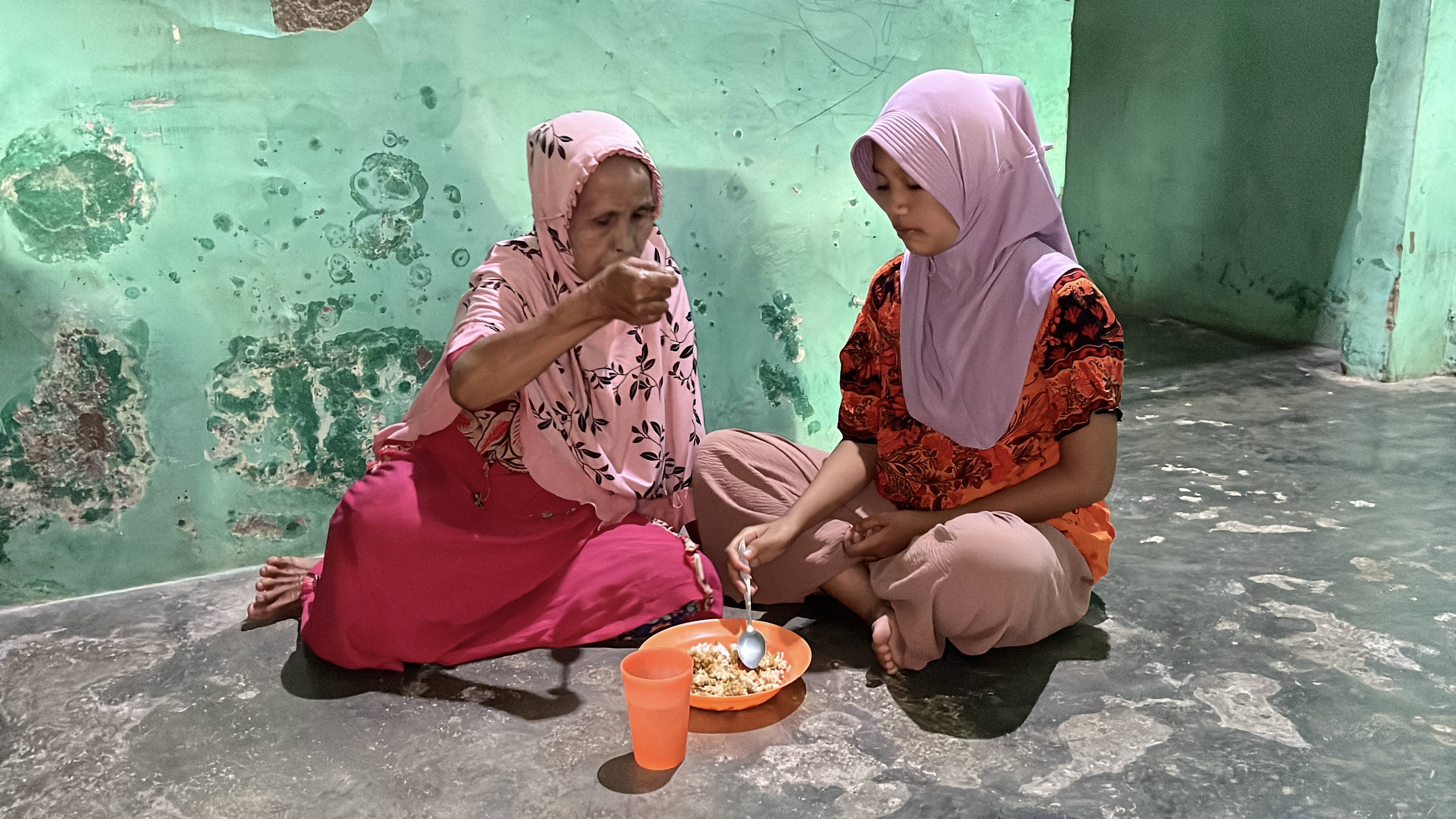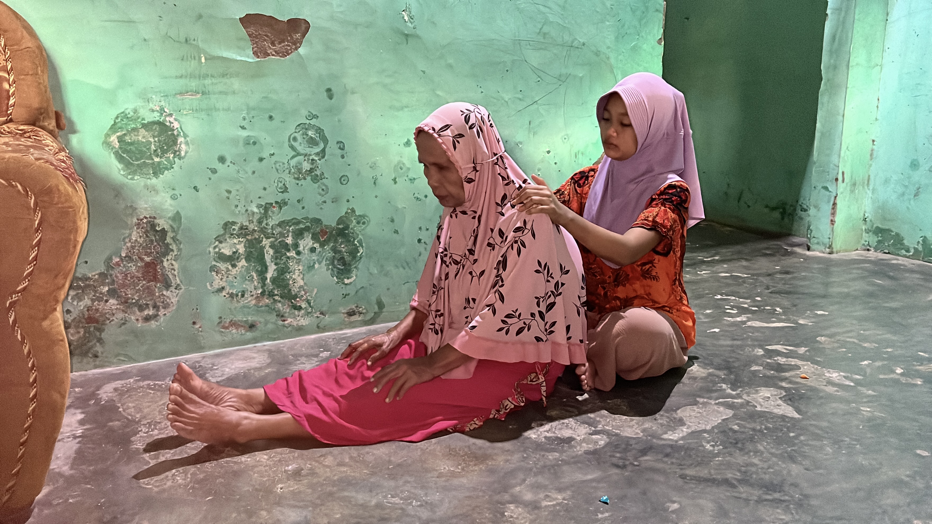Nenek Sumiati dulu bekerja sebagai buruh tani, namun kini tak lagi mampu bekerja karena usia renta dan penyakit asam urat yang sering kambuh. Tak ada lagi penghasilan tetap untuk mereka berdua.
