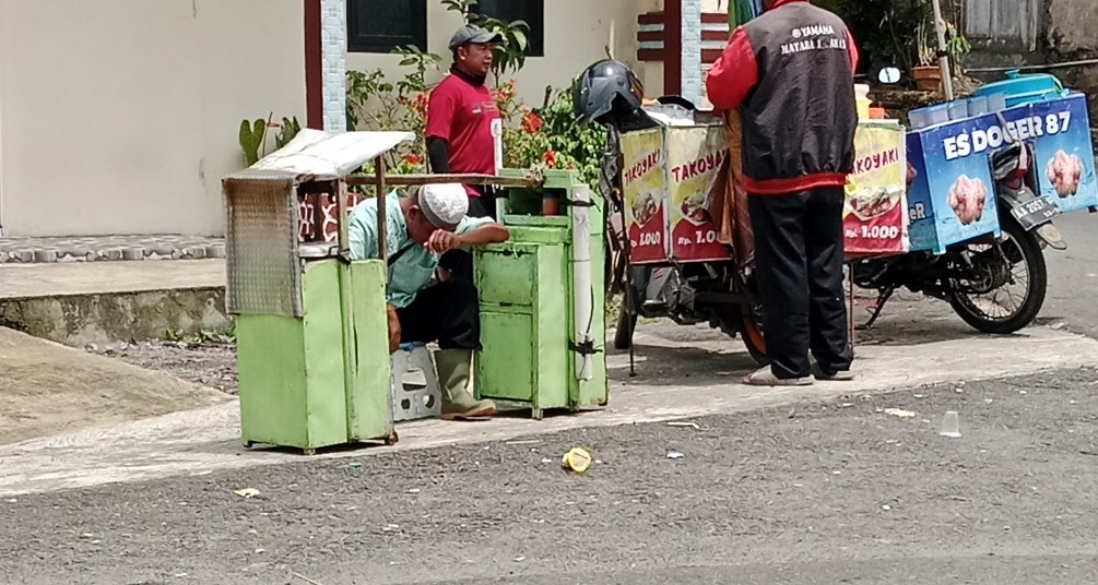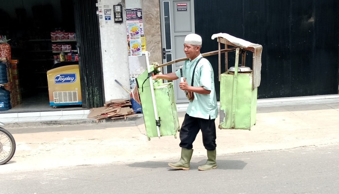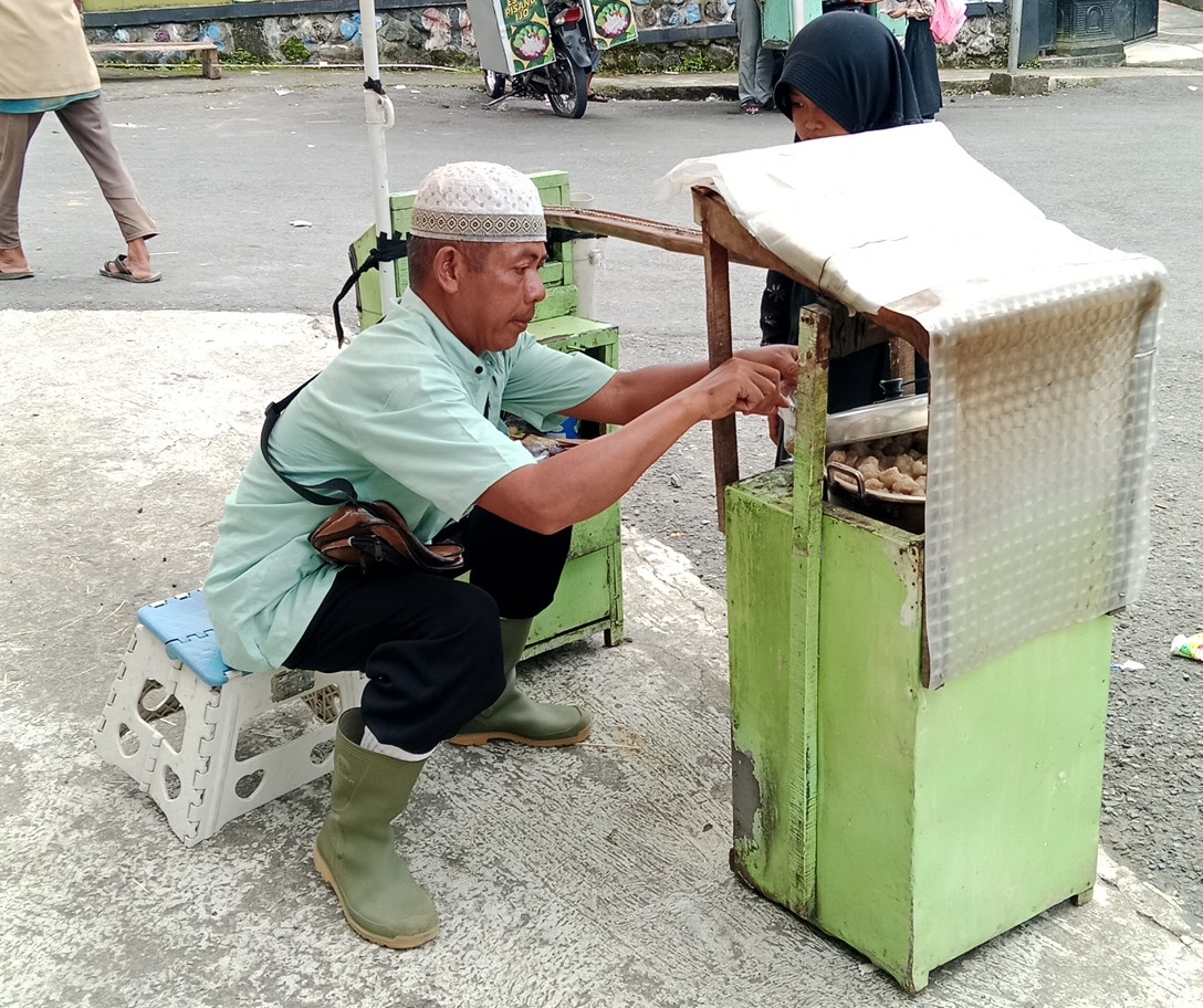 Pak Ahmad penjual pentol keliling yang memikul dagangannya dari pagi hingga malam.