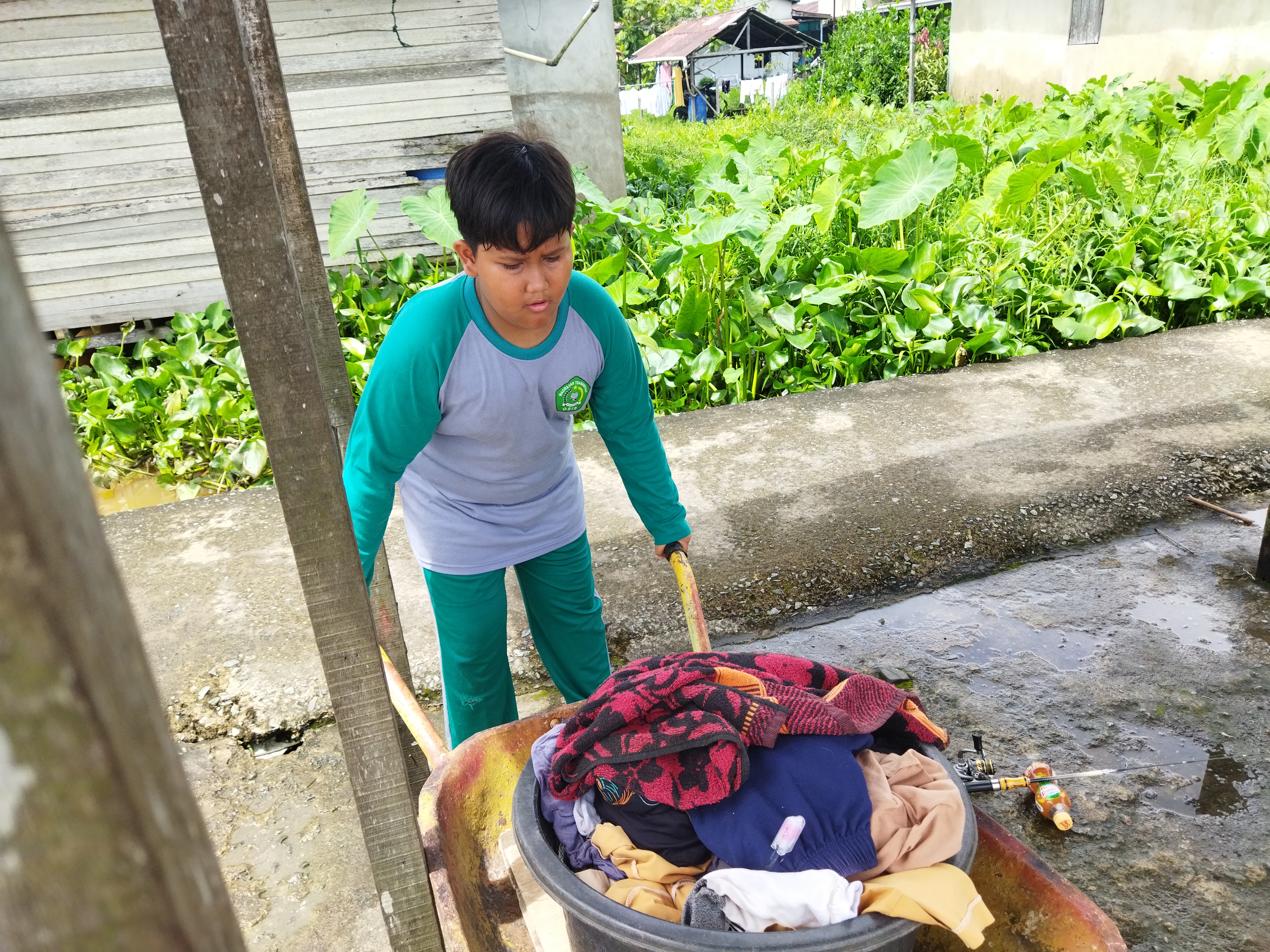Untuk bertahan hidup, sepulang sekolah ia membantu ibunya menjadi buruh cuci baju yang dibayar hanya 20 ribu dalam 2 hari sekali.