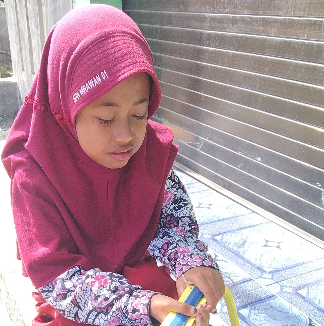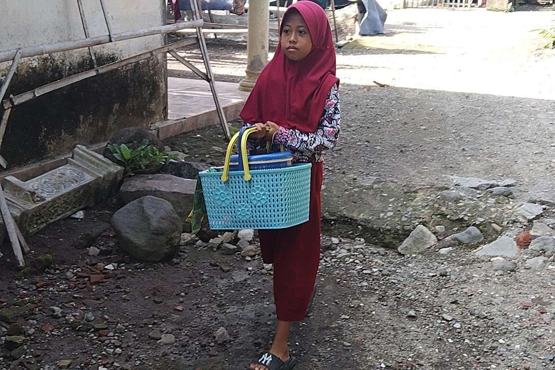 Setiap hari sepulang sekolah, Zahra keliling kampung menjual es dengan keranjang kecil di tangannya.