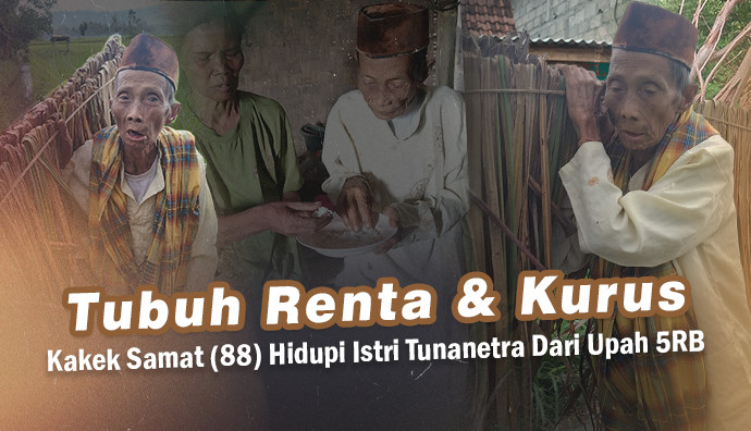 Keadaan itu tidak berlaku untuk Kakek Samat. Lansia 88 tahun ini justru harus berjuang demi bisa makan. Istri yang dicintainya mengalami kebutaan sehingga tak bisa membantu kakek bekerja.