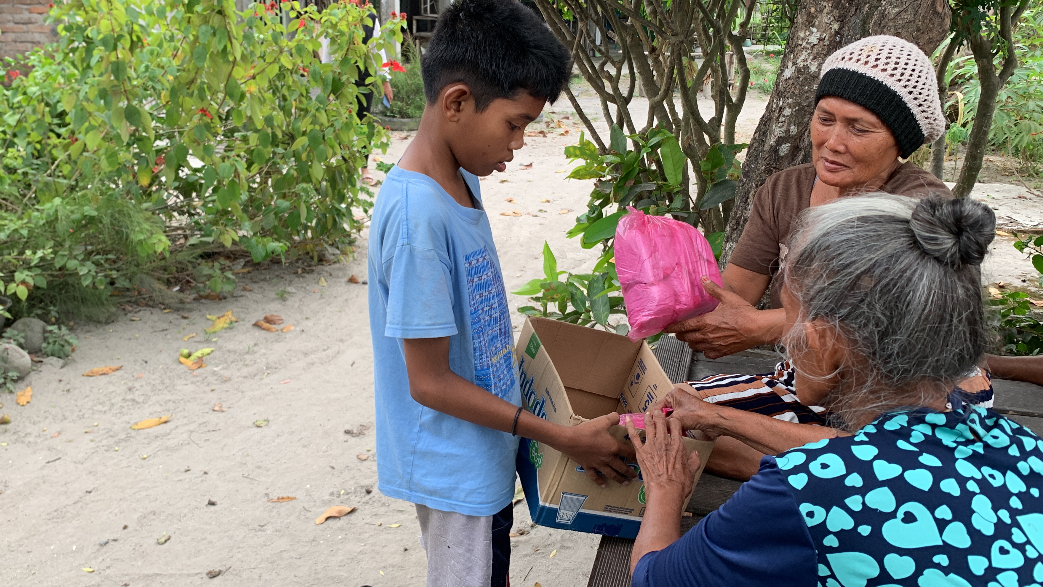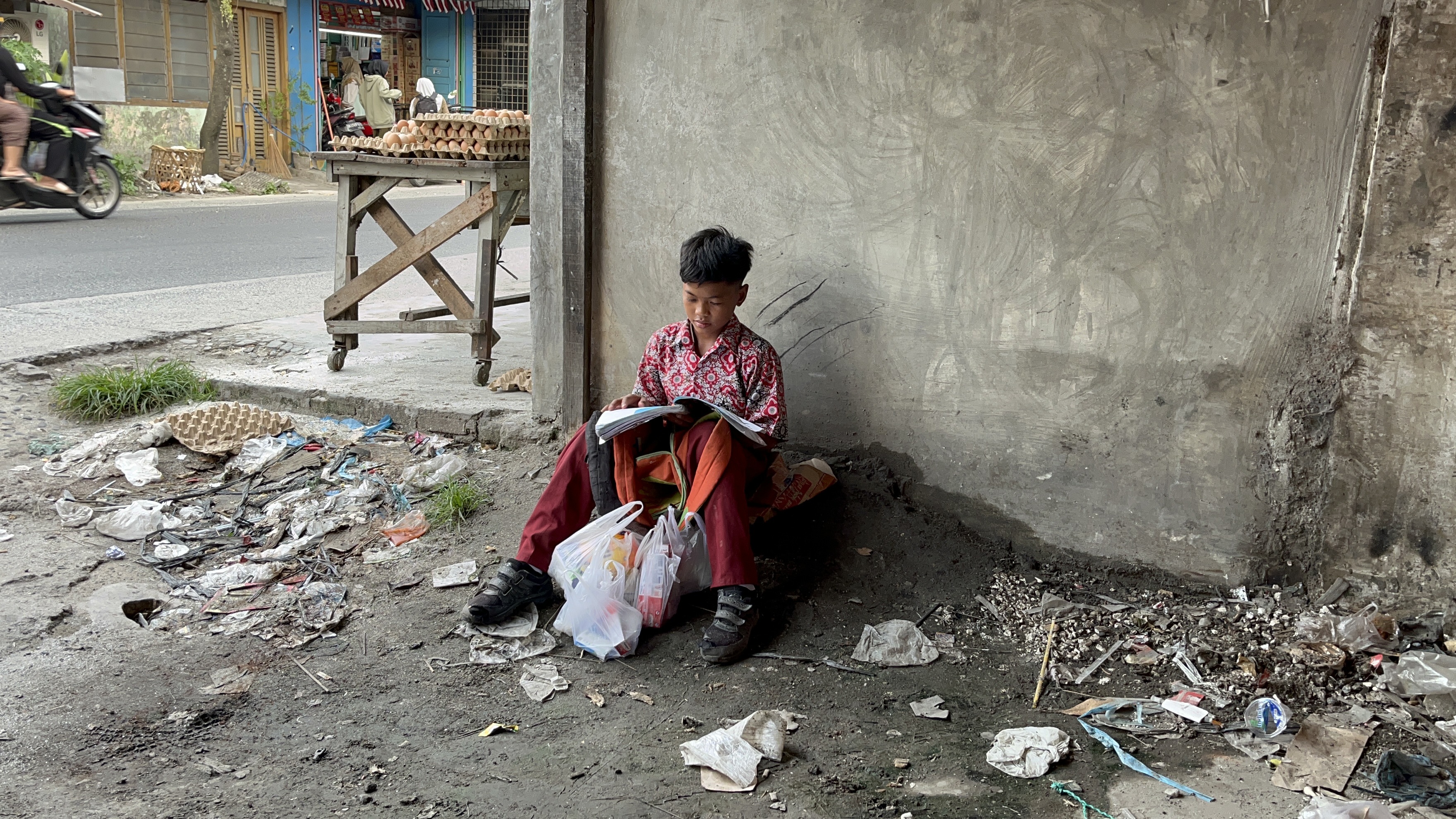 Kondisi yang sama pun dirasakan oleh Abu (11). Setiap hari sepulang sekolah ia berjualan keliling pasar menjajakan dagangannya. Ada tisu, sabun, garam, dan pasta gigi. Semua ia lakukan demi adik dan neneknya bisa makan.