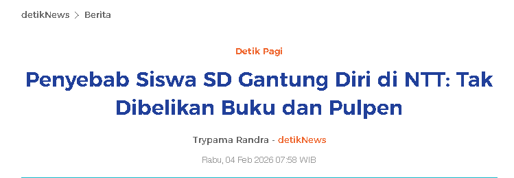 Kasus anak SD di Nusa Tenggara Timur yang mengakhiri hidupnya ini dinilai sebagai alarm keras bagi masyarakat kita. Bagi kita yang sampai saat ini masih rutin ngopi dan kongkow di cafe dengan teman-teman. Padahal.. bagi seorang anak di daerah tertinggal, buku dan pena adalah paspor untuk diterima di lingkungan sosialnya, yakni sekolah.